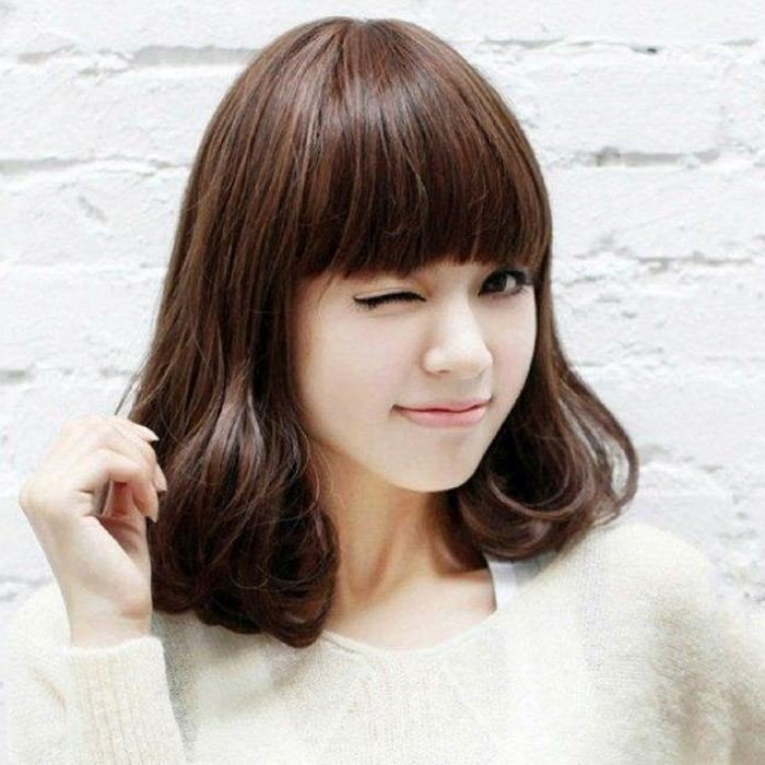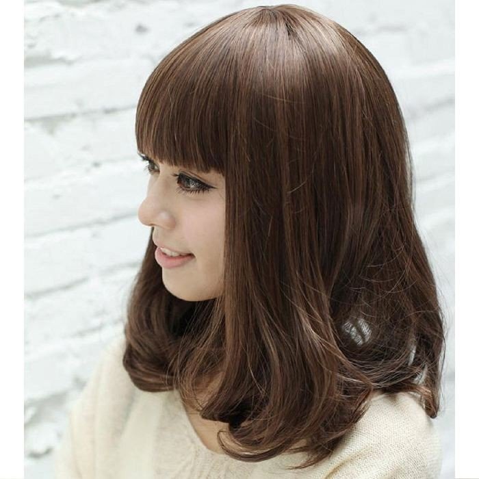 レディース フル ウィッグ セミ ロング 耐熱 ミディアム カール 前髪 ネット 付き (ダークブラウン)