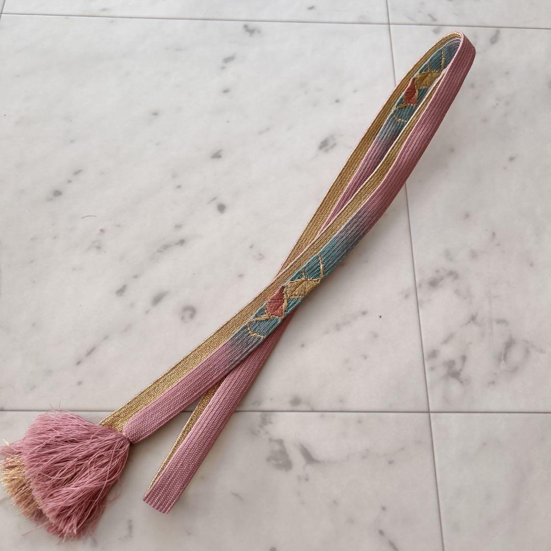 淡いピンクを基調に、金糸や多色糸の刺繍が施された華やかな帯締めです。房の先には金糸も織り込まれており、フォーマルな場面にぴったりの上品なデザイン。しっかりとした組みで適度なハリがあり、帯周りを美しく引き締めてくれます。