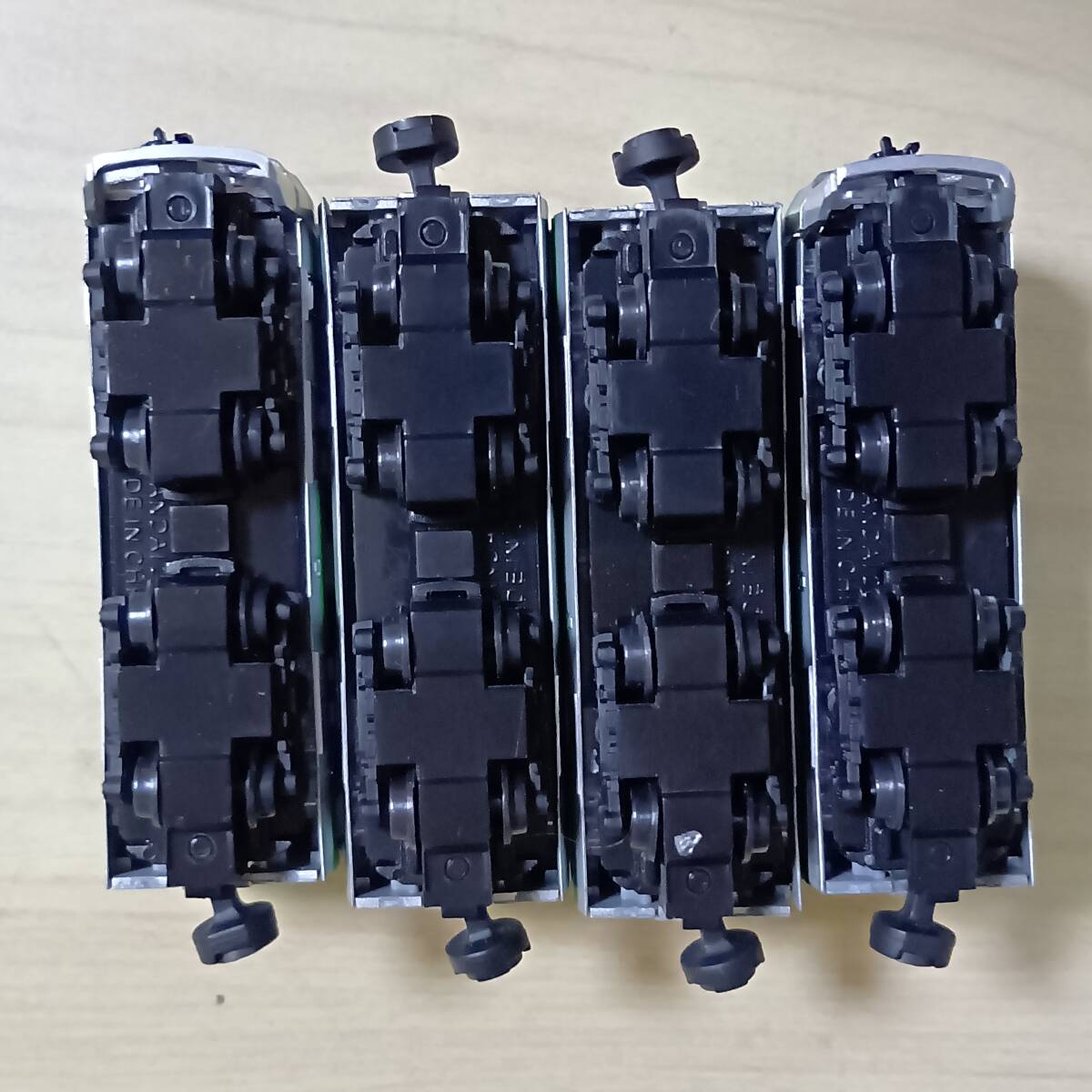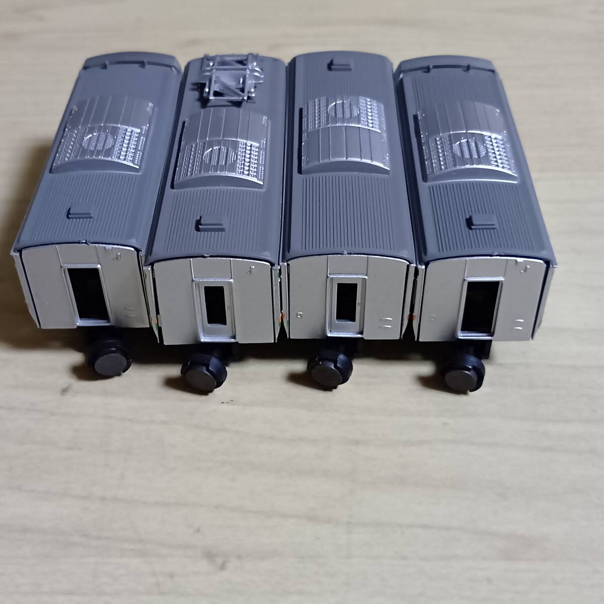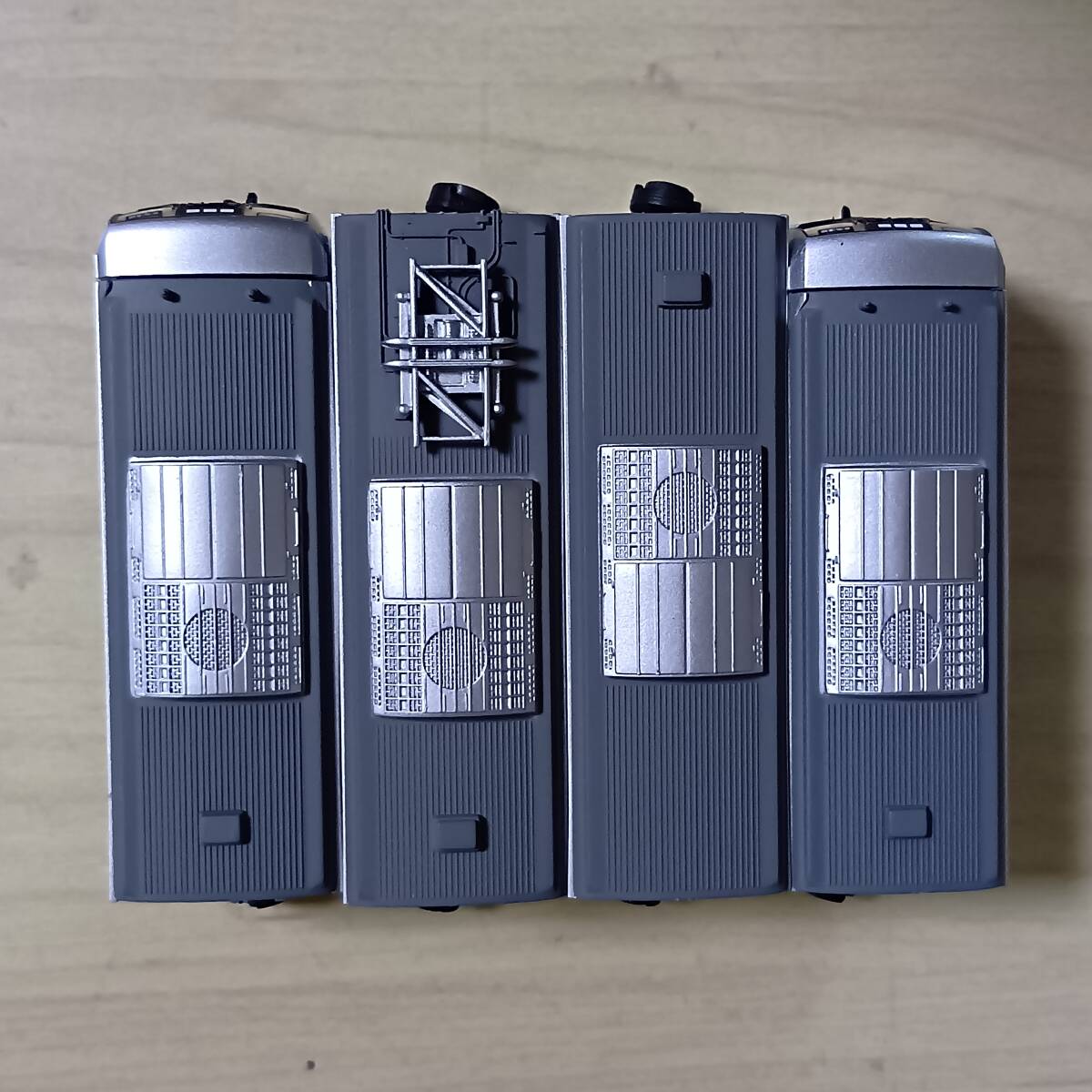 写真のもの送ります。きれいなものもあれば、塗装はげ、色付き、傷、欠品、壊れている(ボディー割れ、スカート割れ他)ものもあります。組間違いや他車部品(妻、レリーフ、パンタグラフ、スカート他)が使われている場合もあります。それらが、ついていない車両もあります。