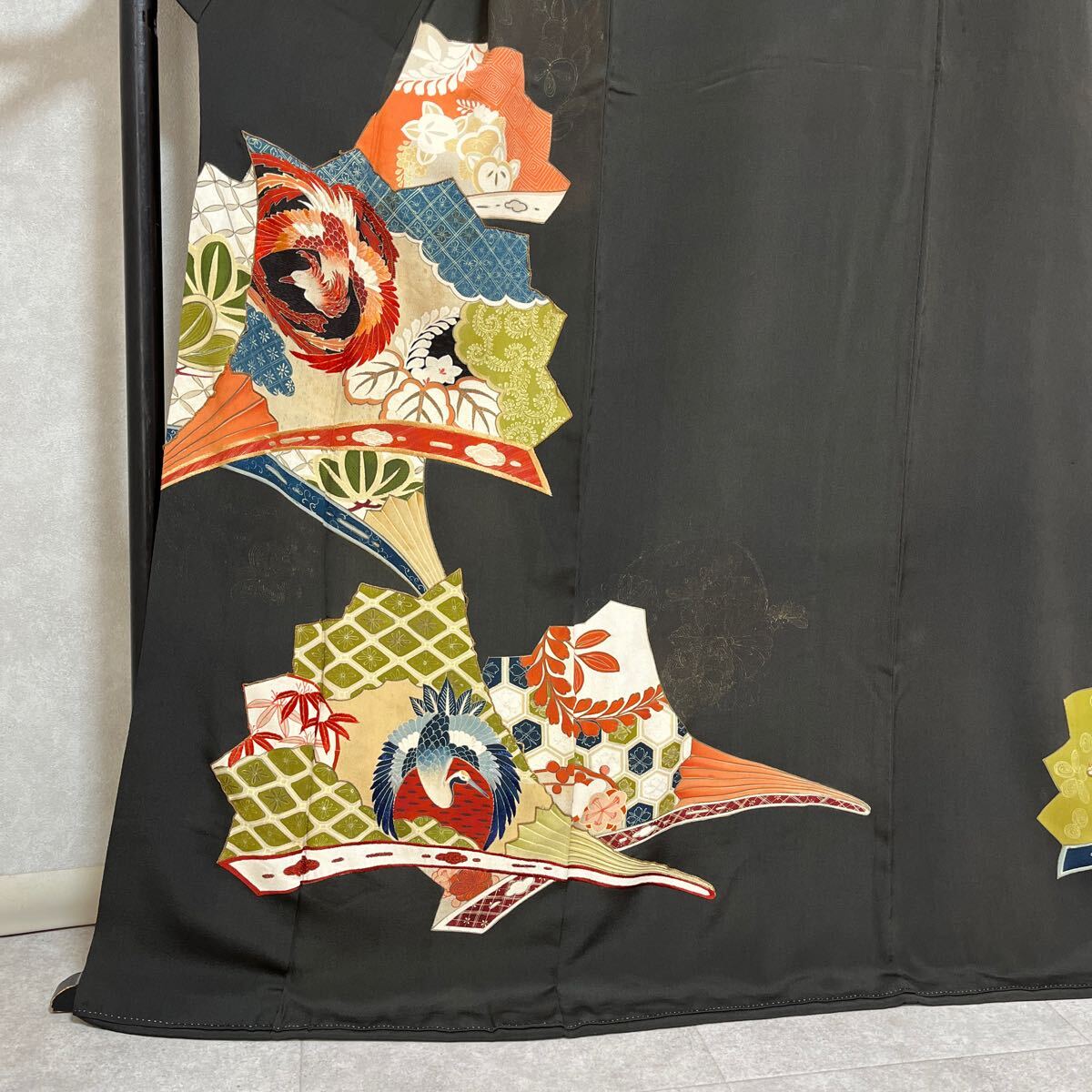 アンティーク 着物 黒留袖 刺繍 鶴 五つ紋 正絹 昭和レトロ 大正ロマン モダン 和洋折衷コーデ リメイク く27-11k