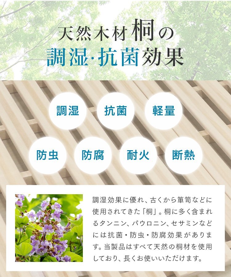 桐は、断熱性と保温性に優れ、寝具を床の冷たさから守ります。