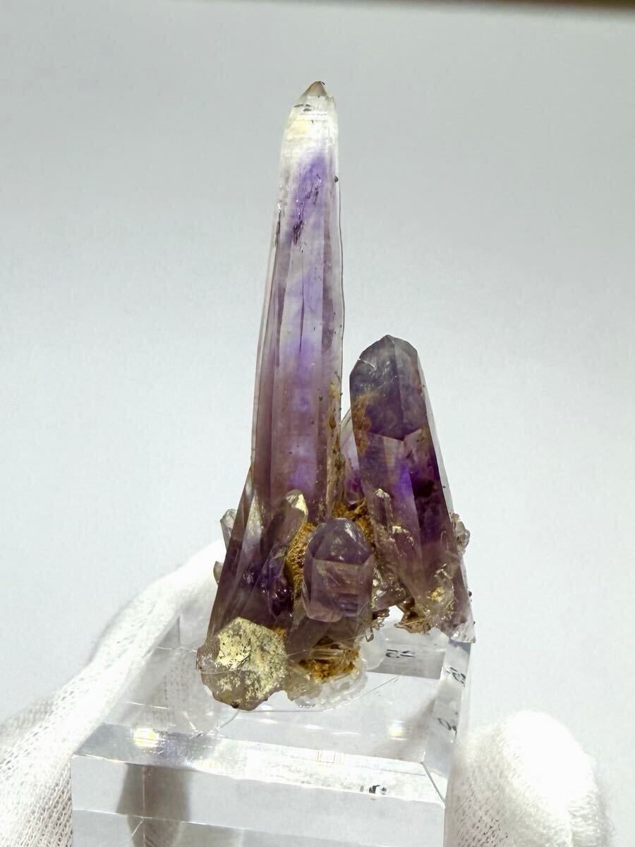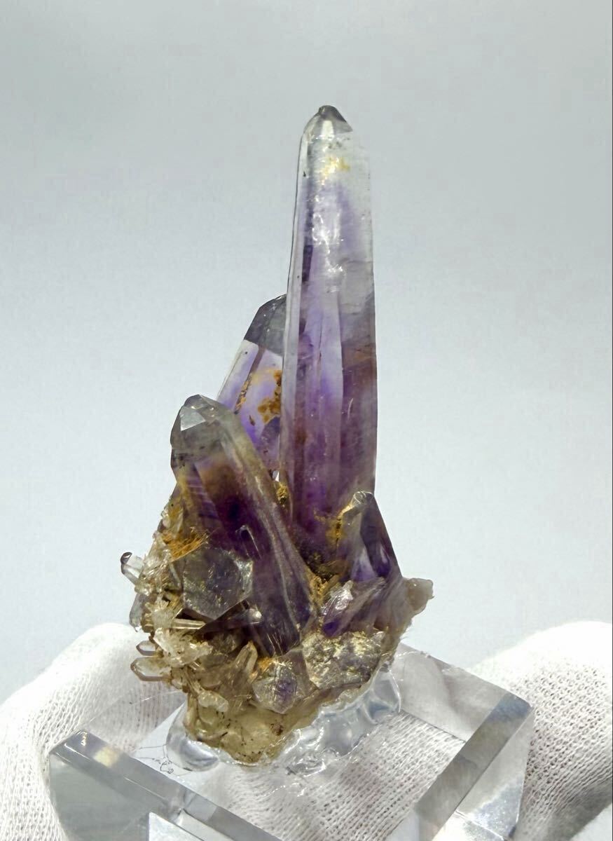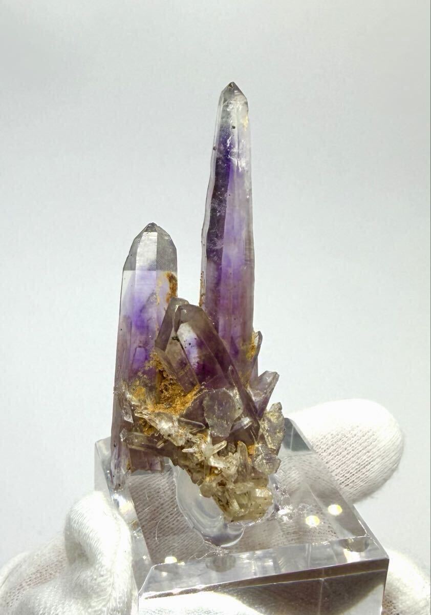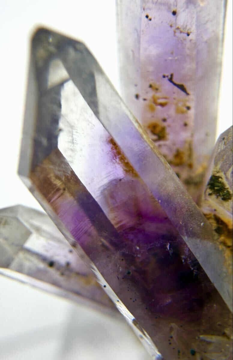 中心部を走る深く力強い紫色と、先端や側面に見られるクリアな水晶部分とのコントラストが際立ちます。まるで水晶が紫色を吸い上げているような、鉱物としての成長の歴史を感じさせる神秘的な美しさです。