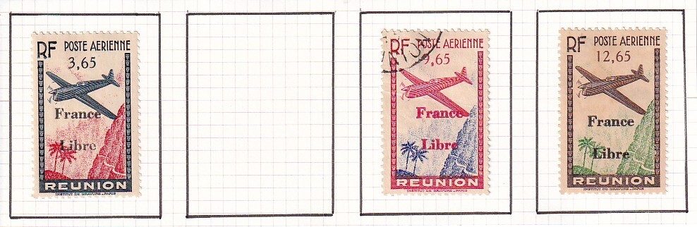 16 レユニオン【未済混合】<「1943 SC#C14-C17 (航空)《France Libre》加刷 on #C2-C5」 3種(3/4,#C15欠、C16:済) on リーフ切取り >