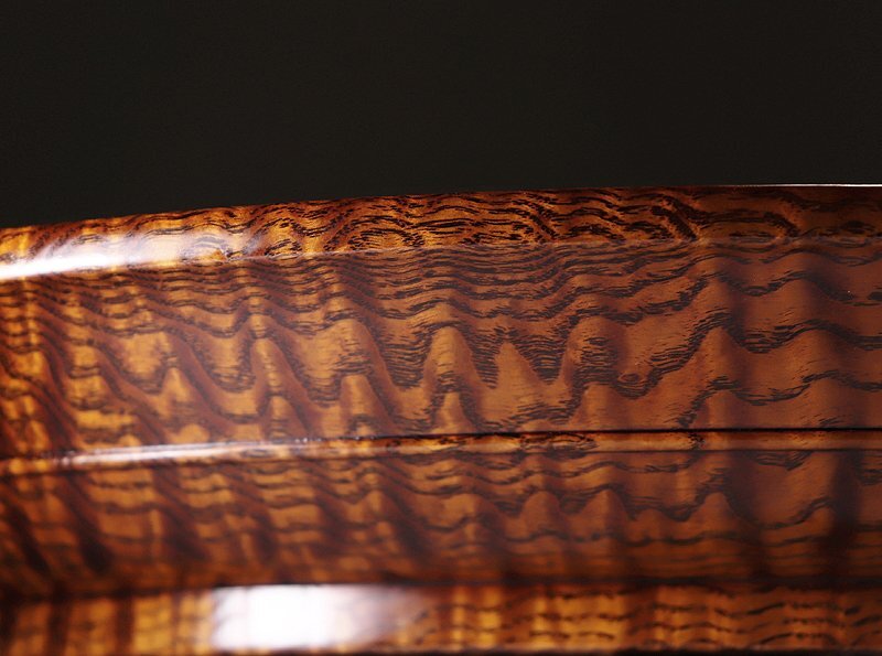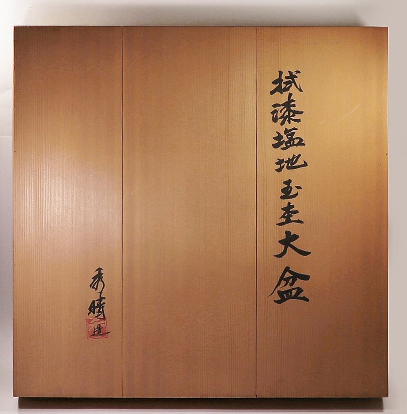 共箱付き。箱書に題「拭漆塩地玉杢大盆」、銘【秀晴】がございます(作家詳細不詳)。 箱蓋見返しには記念銘が記されており、昭和61年(1986年)頃の制作と見られます。