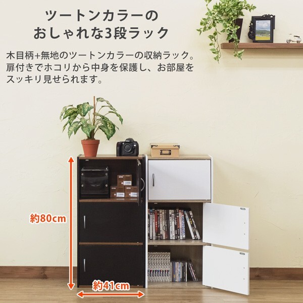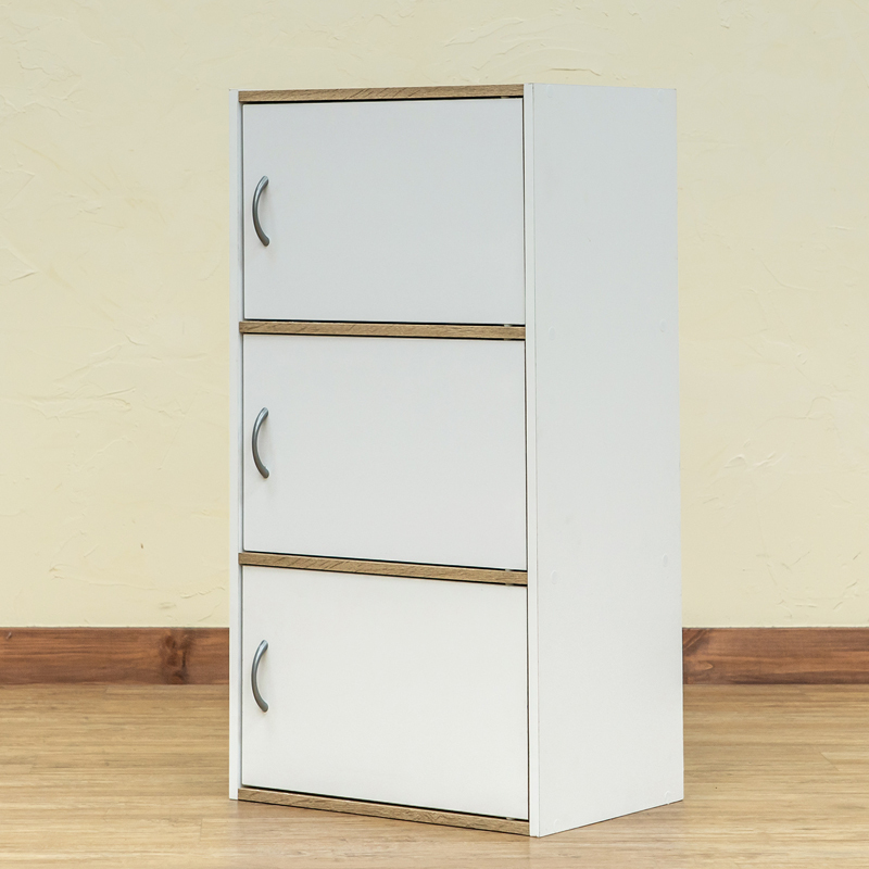 3段ラック 扉付き カラーボックス 幅扉収納 ロッカー 棚 一部木目柄 ホワイト HMP-25(WH)