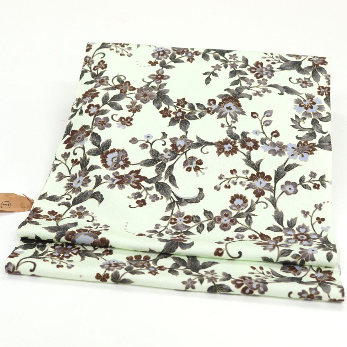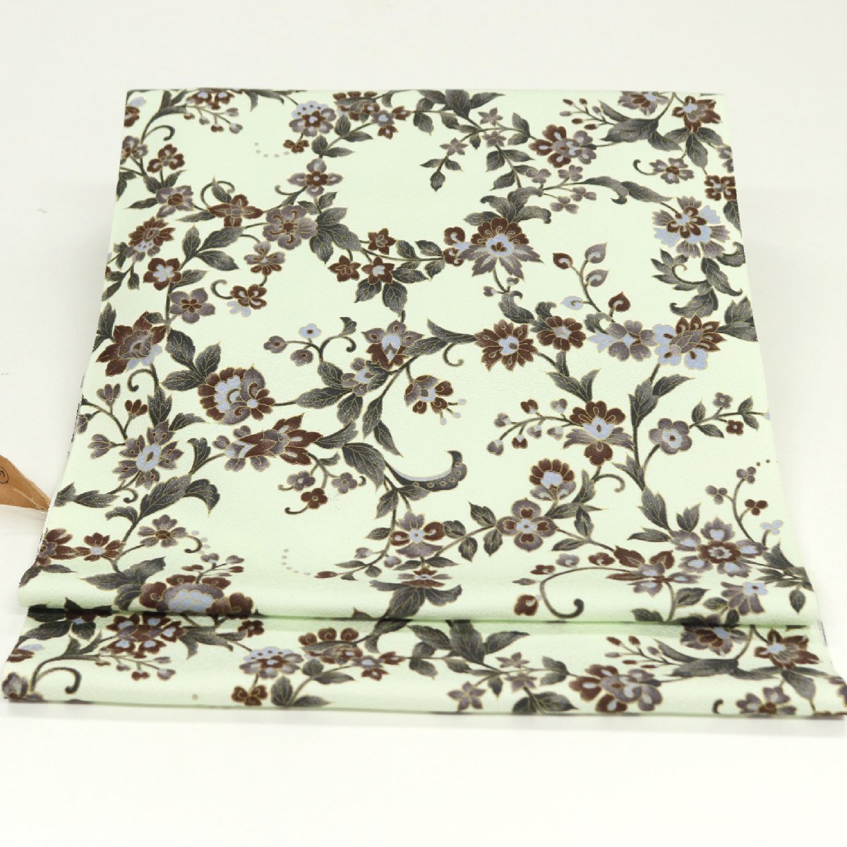 しなやかな帯地はライトグリーン色のお色目でございます。帯地には細かな地紋が施されております。