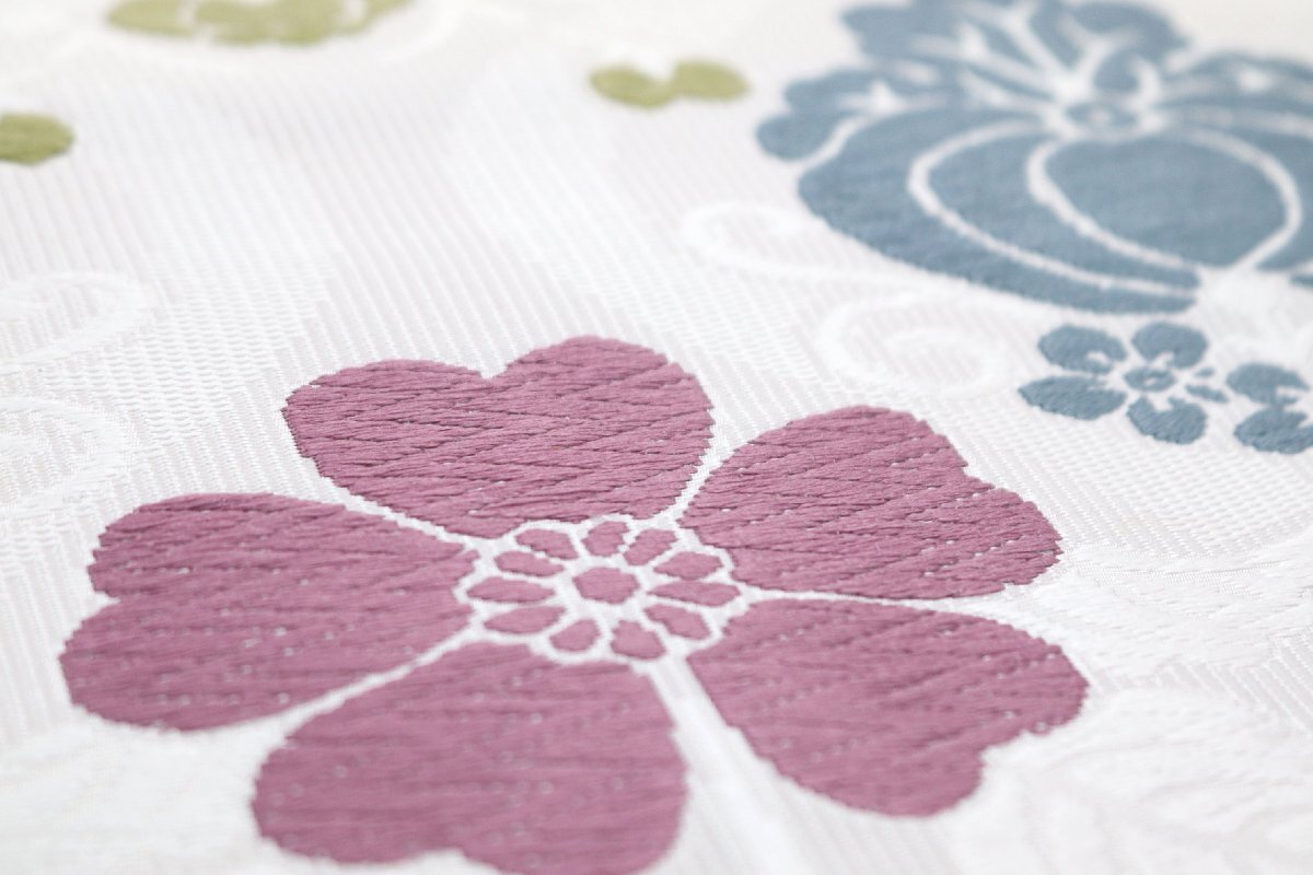 全体にはオフホワイトや山吹色、赤紫色、紺鼠色、柳茶色、小豆色などのお色目の花模様が織り上げられております。