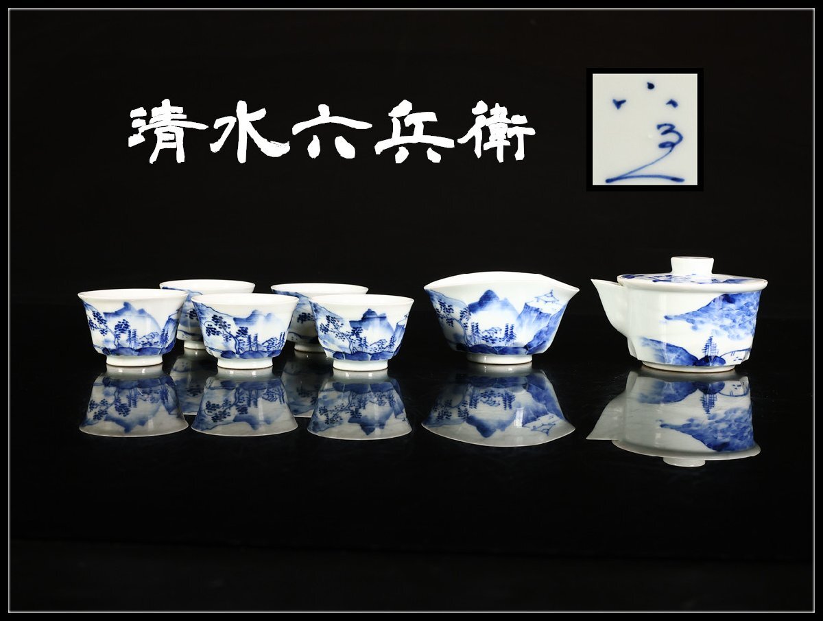 Product name: 【吉】CN473 京焼名工 【清水六兵衛】 染付山水紋 宝瓶 湯冷 湯呑 7点セット/美品R!