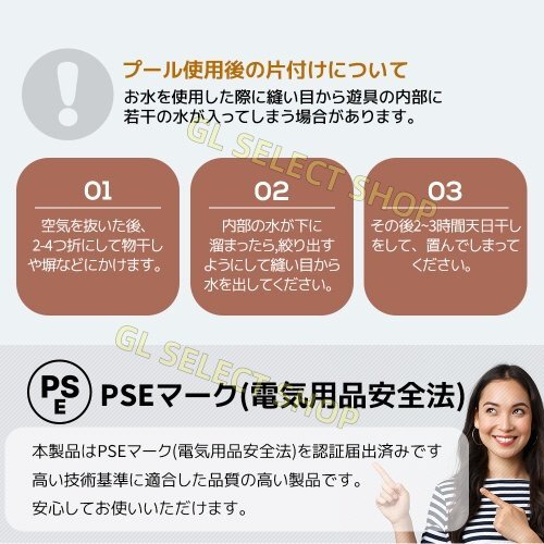 • 【プール使用後の片付けについて】お水を使用した際に縫い目から遊具の内部に若干の水が入ってしまう場合があります。 01 空気を抜いた後、2~4つ折にして物干しなどにかけます。 02 内部の水が下に溜まったら絞り出すようにして縫い目から水を出してください。 03 その後2~3時間天日干しをして、畳んでしまってください。