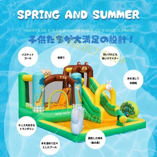 • 【子供たちが大満足の設計!】①スライダー短いけれども高い、スリル満点!熊さんデザインの扉から滑り降りて、下にウサギちゃんが待ってるよ!カワイイ!②小さい子でも安心の浅型プールスライダーから降りた先には涼しげな広々としたプール。ここで水遊びを楽しんで、夏の暑さを吹き飛ばします!横にはクジャクのサイドフレームがあるので、ママ、パパはもっと安心!象の鼻も噴水です!特別なデザイン  子供たちは涼しい水を感じて楽しめよう!③ホースをつなげてシャワーシューターママ、パパも濡れずにこども達と水遊びを楽しめます!④ふかふかのトランポリンZOOに入ると、トランポリンがある!周りに落下防止ネットが付きで、思いっきり飛んで遊べる!⑤バスケットゴールトランポリンをジャンプして、ボールを投げることで、お子様の運動神経を向上に!⑥手足を使って岩登り足をズボッといれて登るステップ。腕や足の筋肉をたっぷり使うことができます。アスレチックのようで達成感も