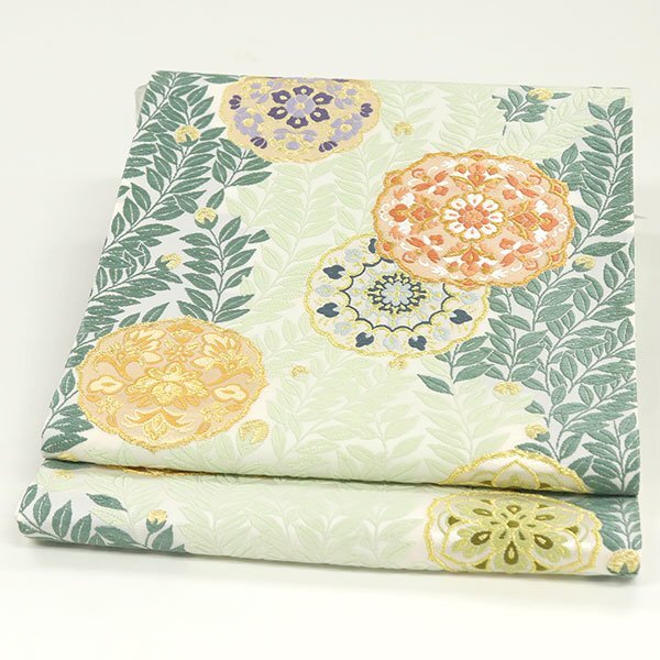 緑色、白緑色、青紫色、橙色、灰青色のお色目で、植物模様の合間に華文がふっくらと織り上げられております。模様には金糸が織り込まれており、柄行にアクセントを添えております。繊細な模様が品のあるお着物によく合うことでしょう。 『山口美術織物』の見事な唐織の技術の高さを是非お手元にてお確かめいただきたく存じます。