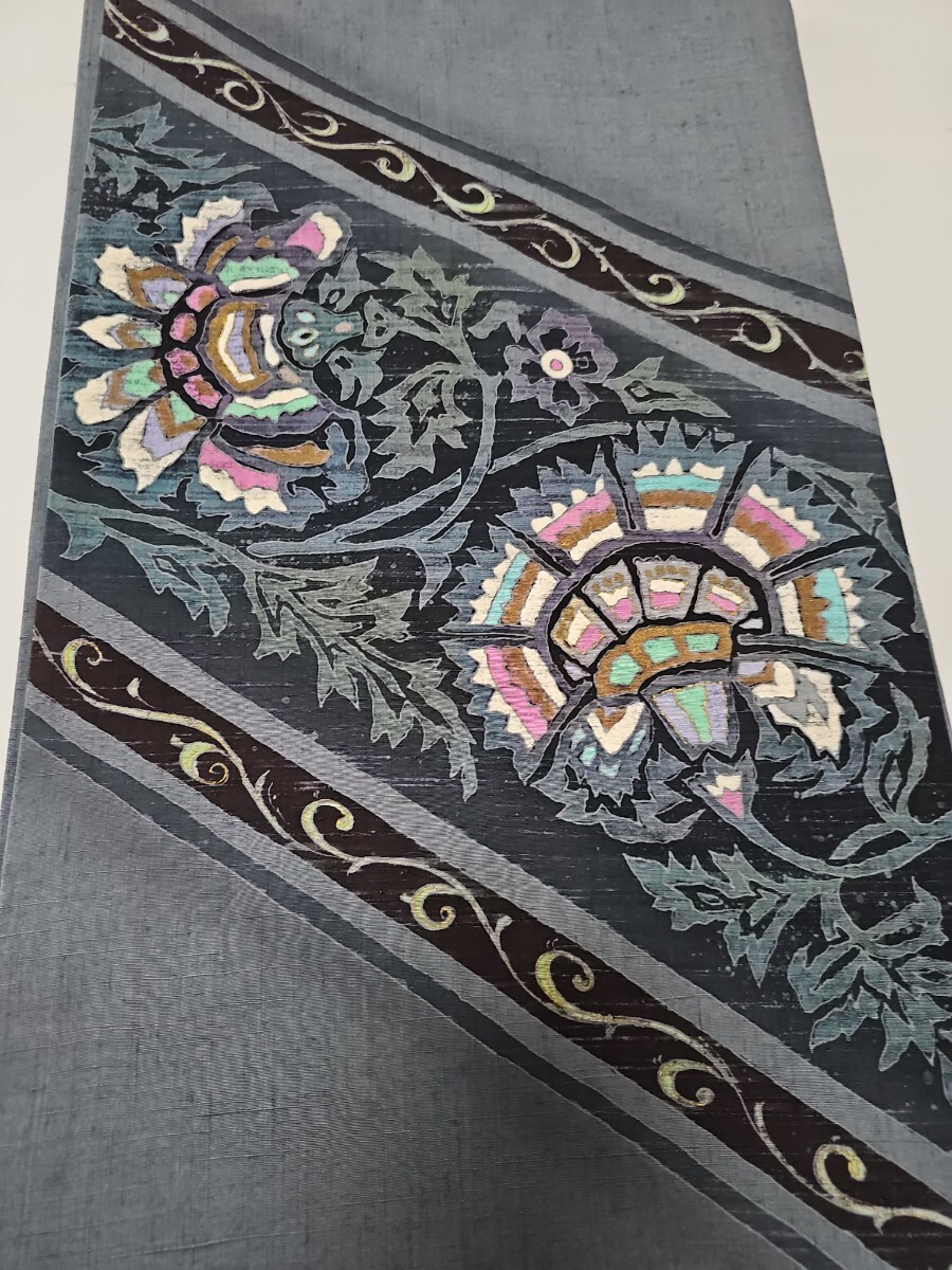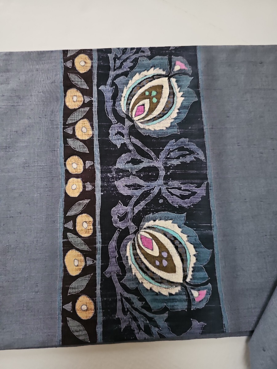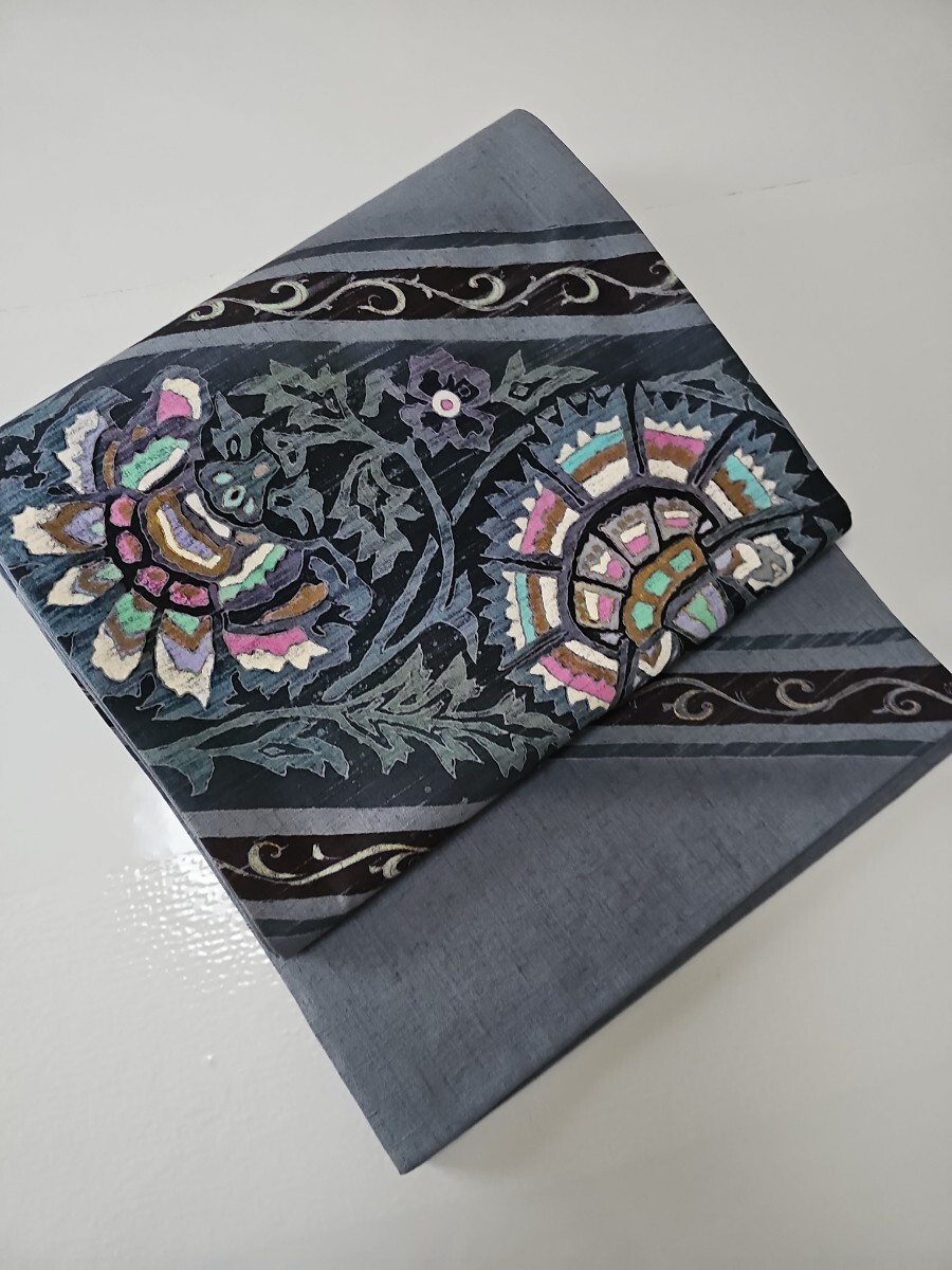 ★真綿紬の柔らかさと程良い張りを有する結城紬地、青灰系、前柄と太鼓に花唐草をアレンジしたモダンな文様を染入れた洒落感の高い上等なお品ものでございます。