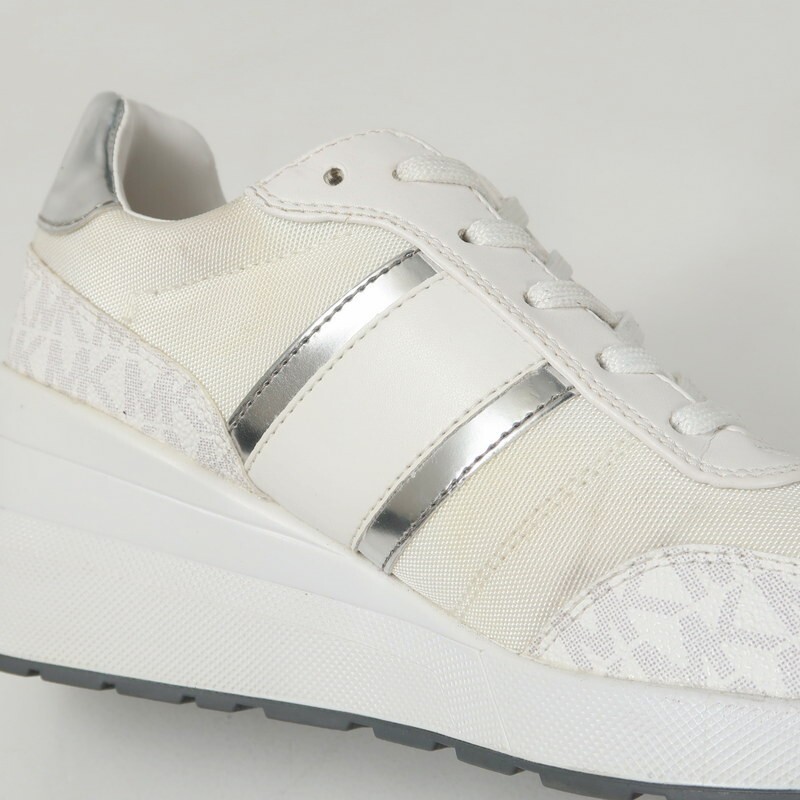 GS4432*MICHAEL KORS マイケルコース MABEL TRAINER 7.5M(24.5cm相当) MKロゴ ウエッジソール スニーカー 靴 ホワイト×シルバー系