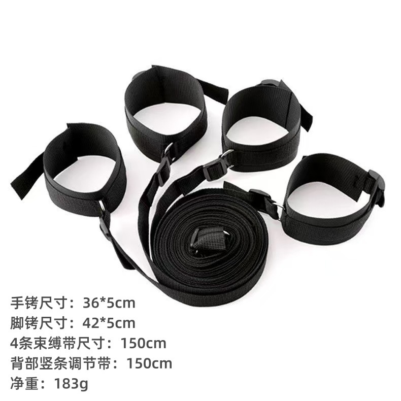 手首と足首を固定できる4つのカフスと、ベッドに固定するための調整可能な長いベルトがセットになっています。カフスは柔らかく丈夫なナイロン素材で、長さの調節が可能です。バックルを調節して、パートナーのサイズに合わせることができます。