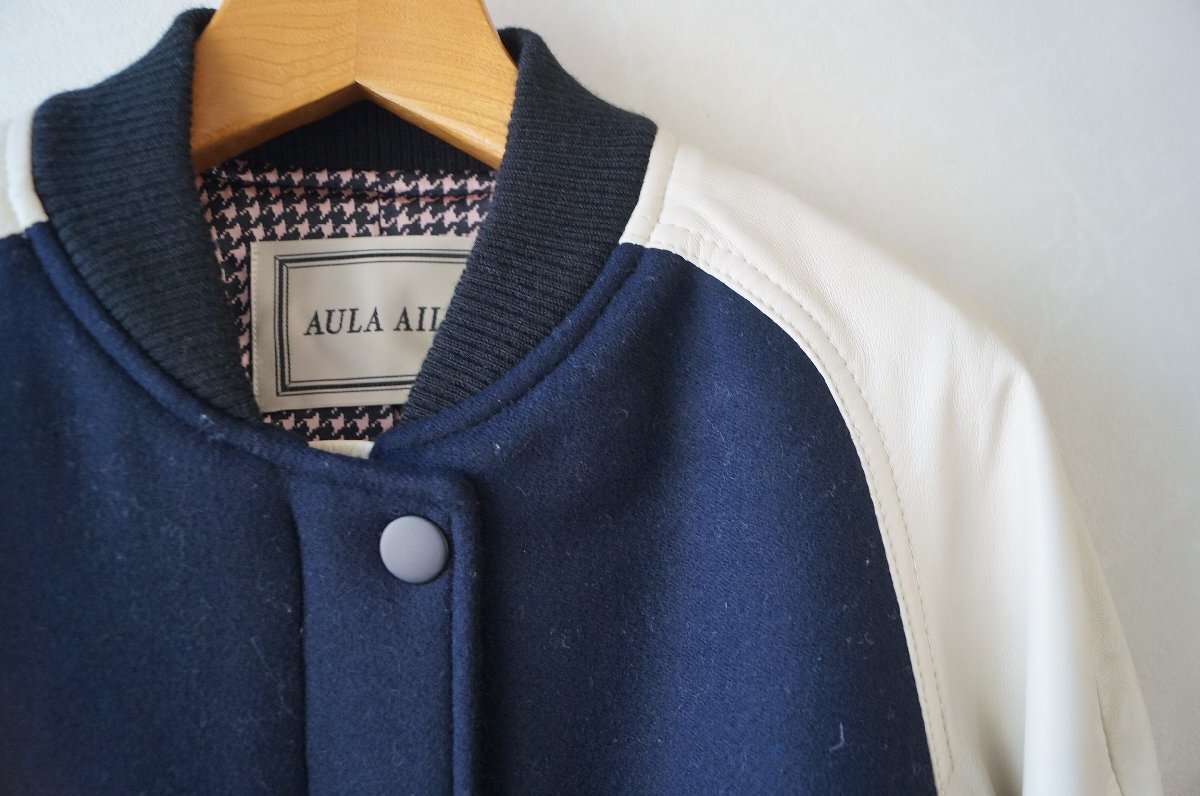 ★AULA AILA(アウラアイラ)*袖革 ウール混×レザー切替 スタジャン /ネイビー×オフホワイト 0 * 古着のgplus広島2510t4
