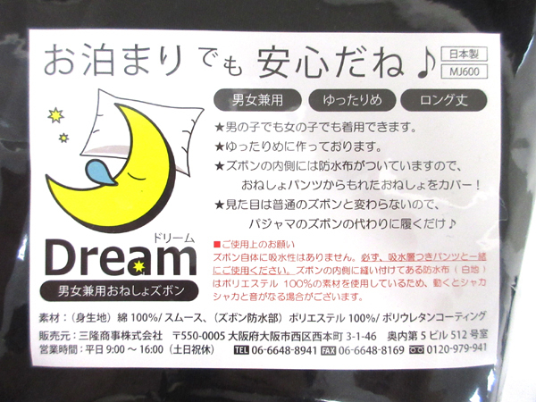 Product name: 送料300円(税込)■ec060■男女兼用 防水布付 おねしょズボン ドリーム(MJ600) 180cm ブラック 日本製 6200円相当【シンオク】