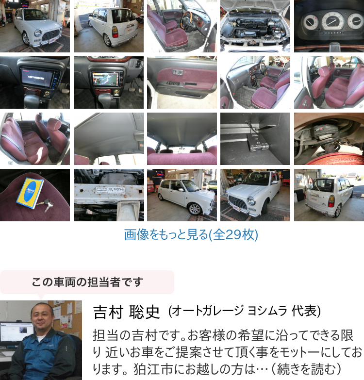 車両状態コメントご覧頂きありがとうございます!車検R9年9月!タイミングベルト交換済み!RSRローダウン!カロッツェリアワイドナビ付き!エンジン、ミッション、エアコン問題無し^^初代ミラジーノはすでに値段が上がり始めている人気車種になります。是非このチャンスを逃さないでくださいね!!試乗大歓迎!気に入れば乗って帰れます(条件あり)
