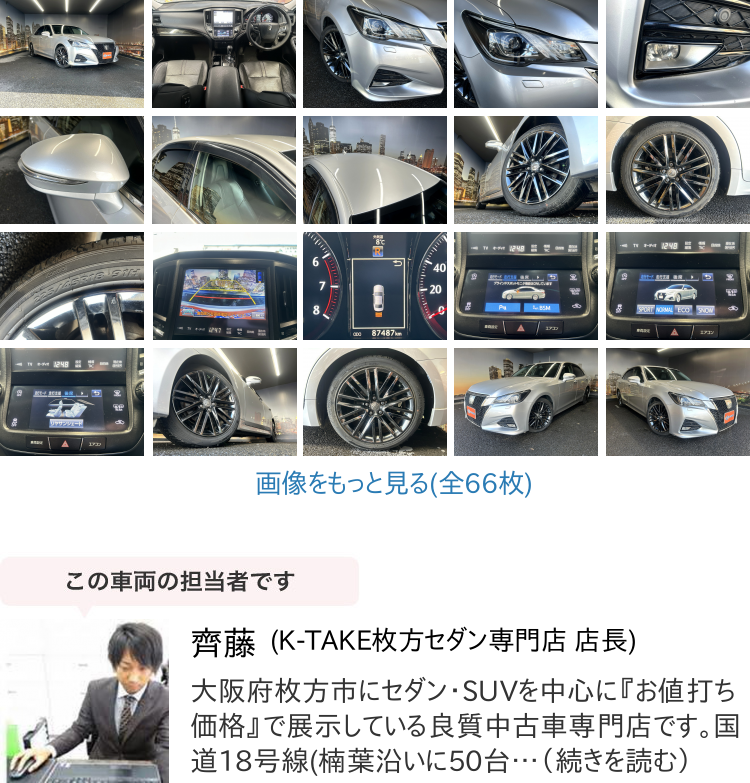K-TAKE枚方店は国産セダン・SUV・ステーションワゴンを中心に取り扱いしております。趣向性の高い車種になりますので、専門知識を持ったスタッフにてご案内させて頂きます。コーティングやカスタム等はもちろん、任意保険、オートローンまで安心のカーライフをお約束致します。整備、保証などのアフターサービスも当店ですべて行えますのでご安心ください。当社は全国のオークション会場、約160カ所と業務提携を結んでおります。全国60000台以上の中古車を当店でご商談、ご契約、ご納車可能です!