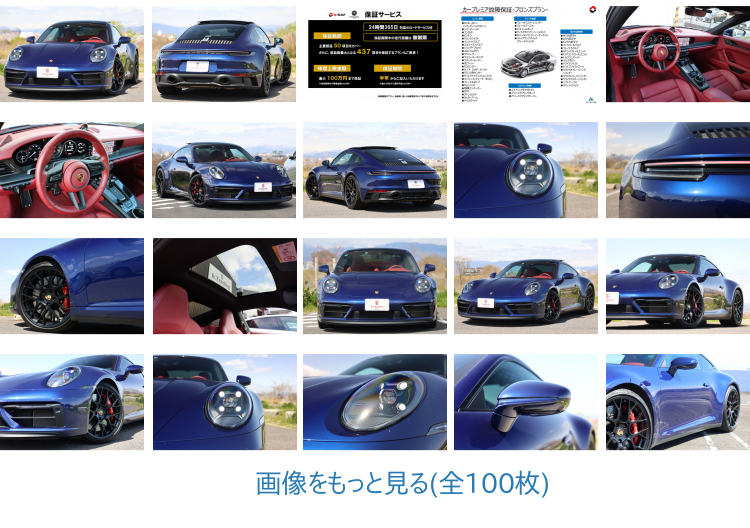 車両状態コメント外装色は有償カラーのゲンチアンブルーM。911の中でもかなりスポーティーなエクステリアのGTSですから、外装色もこのくらい派手なくらいがちょうどいいです。細かな飛び石はどうしてもありますが、目立つ大きな傷はありません。足元はGTSでは珍しい20/21インチ RSスパーダーで決まっています!内装は赤のフルレザー仕様!