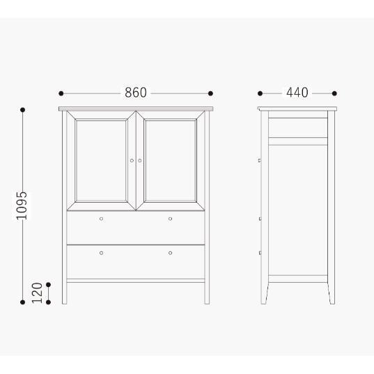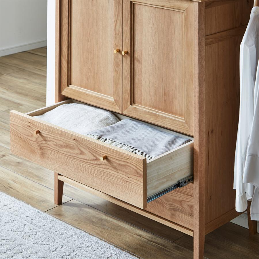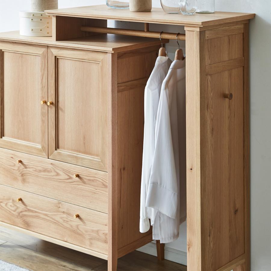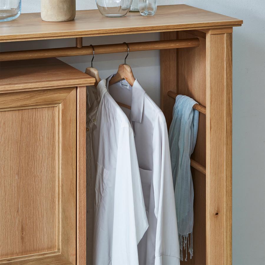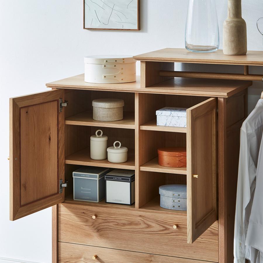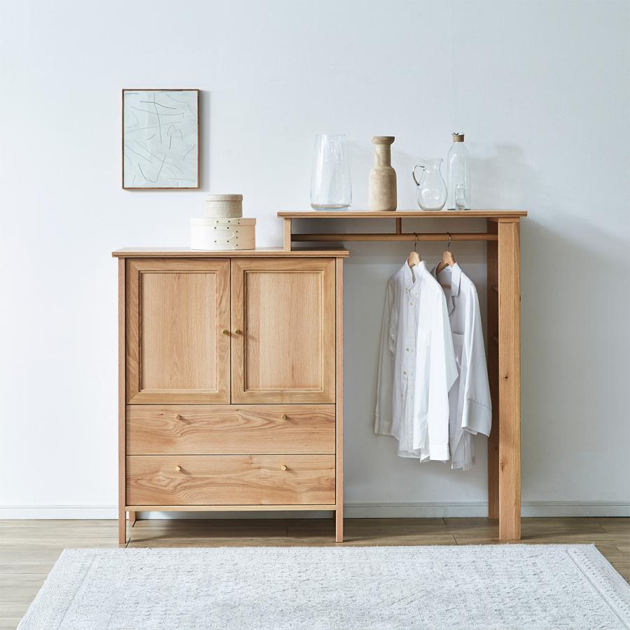 チェストの両開き扉には額縁のような加工、チェストとハンガー両方の天板には無垢材で飾りの加工を加えるなど、細部にまで配慮を欠かさないデザインです。