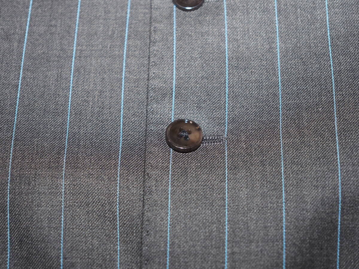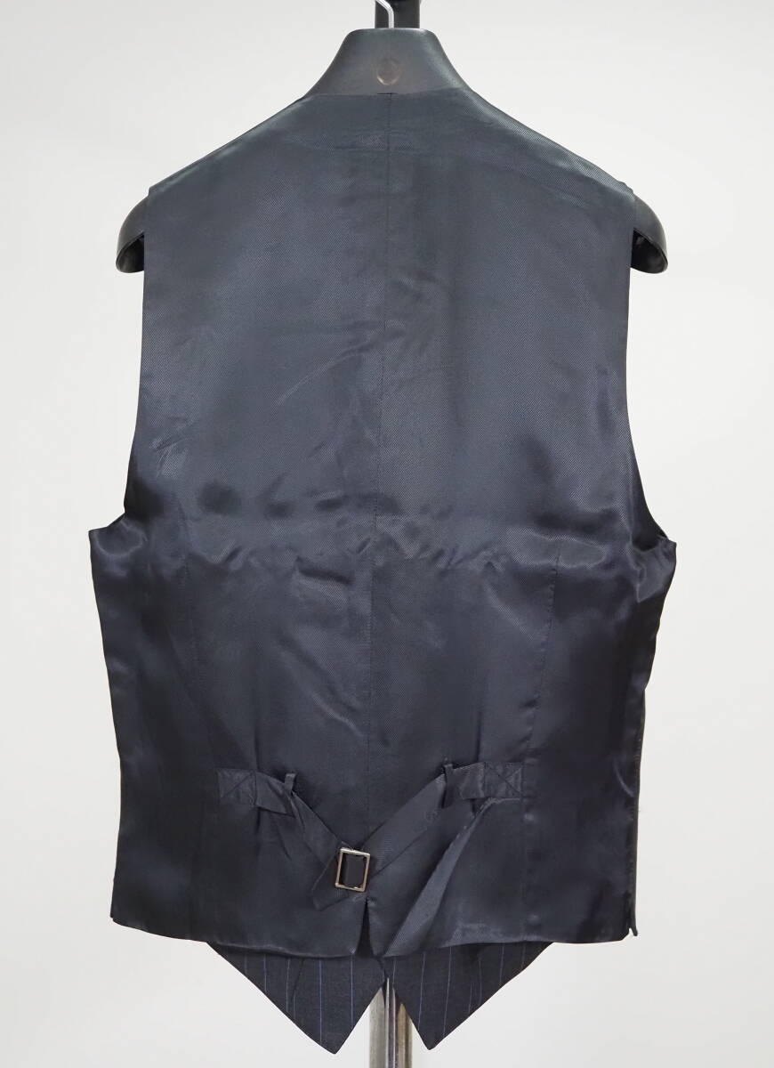 ピンストライプの入った上質なウール素材のジレです。フロントは5つボタン、バックベルト付きです。