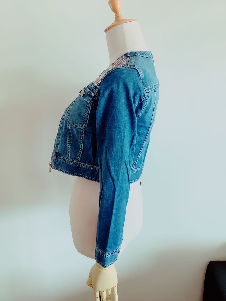 ★ストレッチデニム。飾りボタンやスタッズ等凝ったデザインです。9号ボディでは前ファスナーは閉めれませんでした。羽織るだけならSサイズ程度の方なら大人でも着られそうです。
