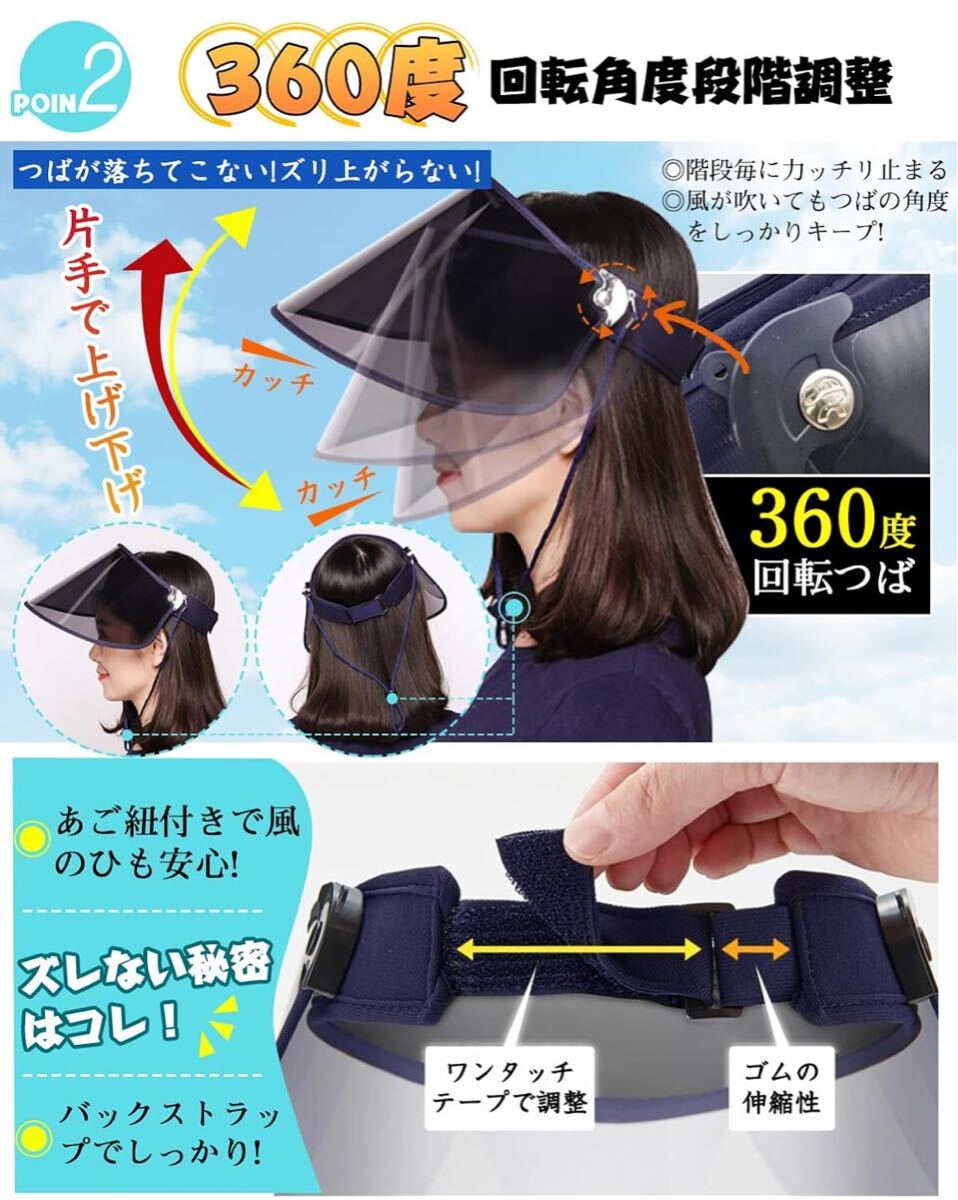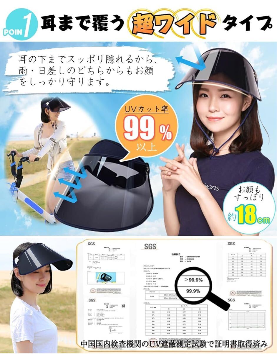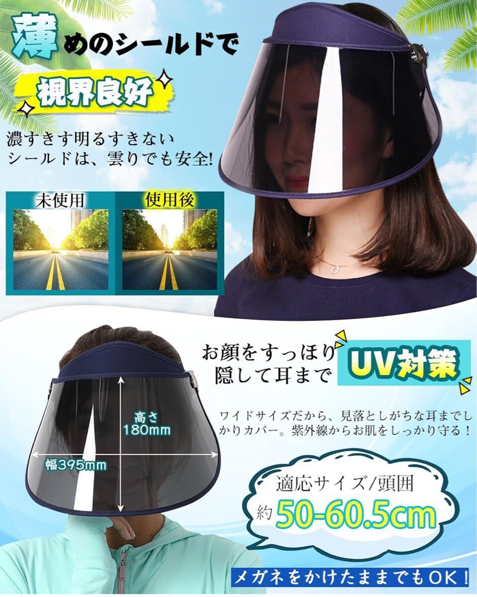 【商品仕様】●カラー:ブラックとブルー ●サイズ(cm):つば高さ18cm 幅39.5cm 厚さ18cm ●適応サイズ:頭囲約50~60.5cm ●素材:裏地…純綿、表地…ポリエステル ●UVカット率:99%以上 UPF(紫外線保護指数):UPF50+ ●付属品:あご紐*1、アームカバー*1、レンズ清潔用クロス*1 ※【使用方法】 キズ防止のための透明保護フィルムがツバ部の表と裏の全面に貼ってあります。表と裏の透明保護フィルムを剥がしてお使いください。※【お手入れ】汚れた場合は、固く絞った布で拭いてください。※【注意点】①色合いはモニター環境により若干の誤差が出ます。②サイズは平置きサイズとなりますので測り方により誤差が出る場合がございます。
