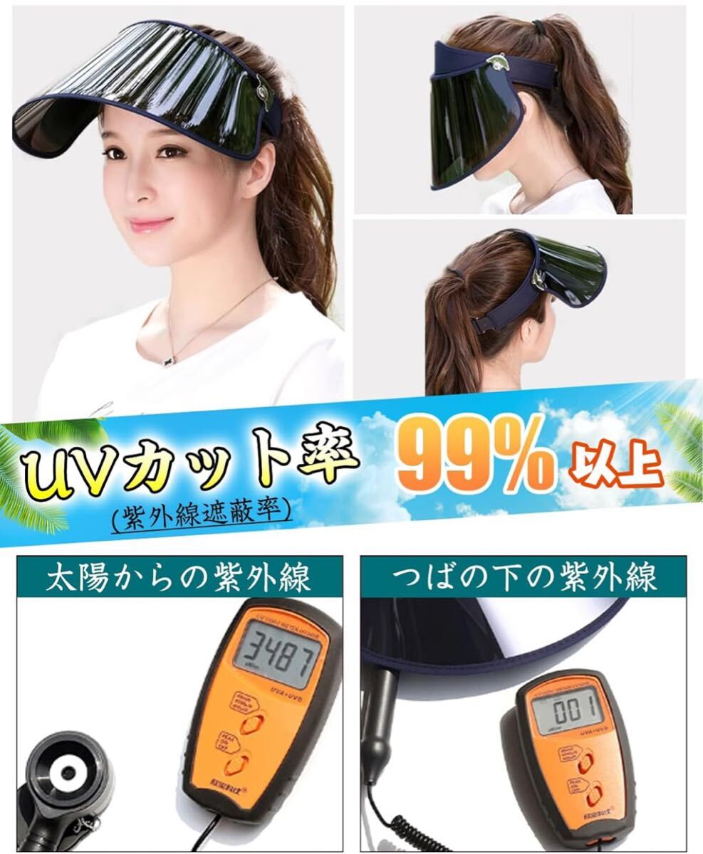 【お肌をしっかり守る高UVカット効果】※つばの表面と裏面に傷防止フィルムがついております。ご使用の前に必ずはがしてご使用ください。このサンバイザーは、肌を守るために特別に工夫されたUVカット加工がされています。実際に、検査機関でも効果が認められており、UPF50+に匹敵するカット率99%以上で、顔だけでなく首や耳など、日差しが強い場所もしっかりガードしてくれます。長いお出かけや、急な外出、運動中でも安心して使える頼もしい味方です。どんなに太陽が強くても、あなたのお肌をやさしく守ってくれるので、外出時も心配いりません!