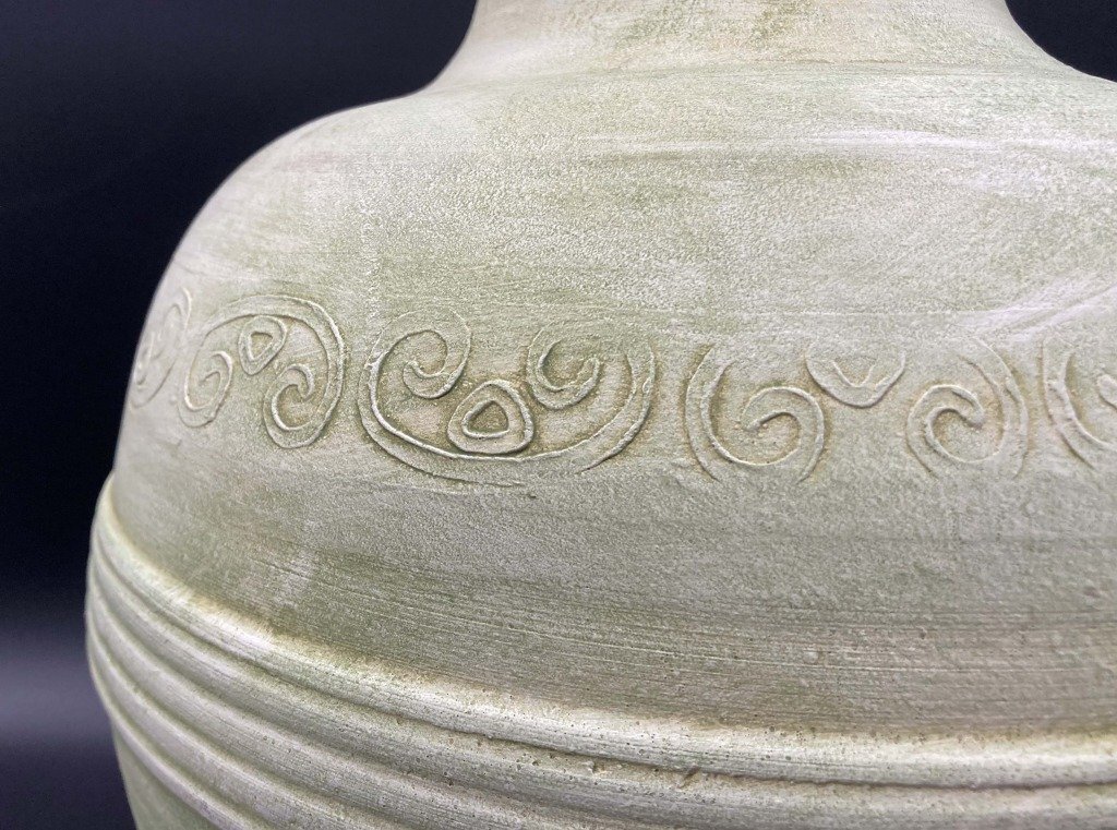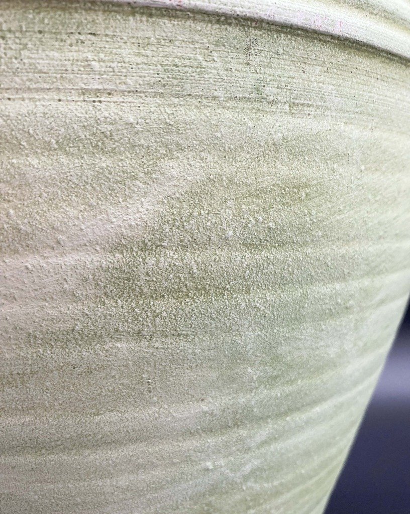 黄緑色の塗装が印象的な、大型の壺です。