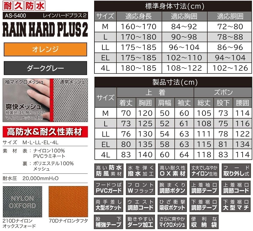 Product name: AS5400/強い!高耐久&高防水&機能性抜群!レインスーツ レインウェア 上下セット オレンジ LLサイズ 耐水圧20,000 バイク ハードワーク