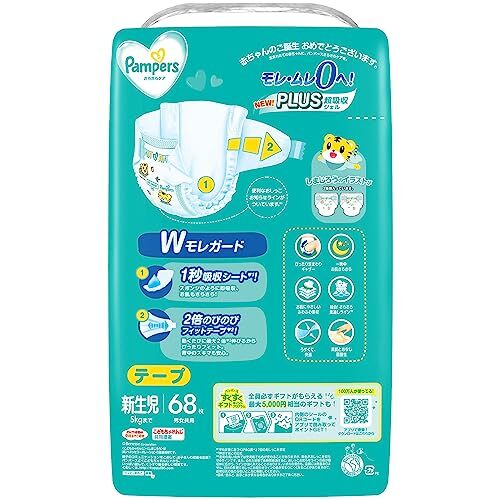・ 新生児 4987176203335・PatternName:2)新68枚(新生児サイズ)・【NEW! パンパース さらさらケア テープ】PLUS超吸収ジェルとWモレガード モレ・ムレ0へ!・【NEW!超吸収ジェル】吸収ジェルを増量*。おしっこやゆるうんちをすばやく吸収・分散させ、赤ちゃんのお肌をさらさらに保ちます。 *従来品との比較・【独自!1秒吸収シート**】スポンジのように即吸収、お肌さらさら **平均尿量に基づく(P&G調べ)2回のおしっこを想定・【2倍のびのびフィットテープ***】フィットテープが伸びてつけやすいから、簡単にフィット。動くたびに最大2倍伸びるから背中のスキマも安心。 ***伸ばす前との比較・10年以上も病産院に選ばれてNO.1のパンパース****。 お肌にやさしいふわふわ素材を使用。最長12時間、一晩中の吸収力。 **** 当社調査(パンパースシリーズの新生児用使用率データ)