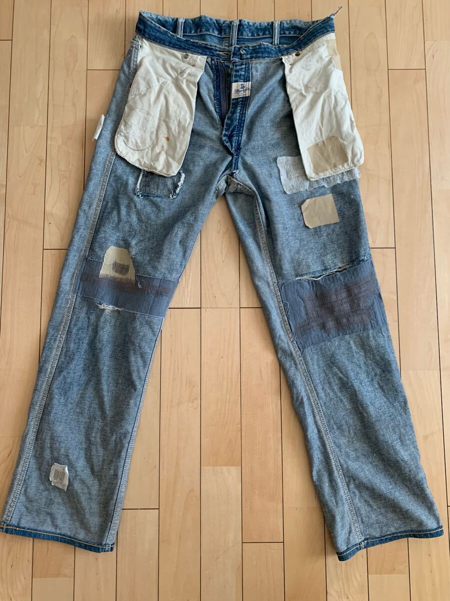 細かくは書きませんが、70年程前のビンテージデニムになりますので、リペア、破れがございます。箇所については写真でご確認ください。着用はもちろん可能で、抜群の雰囲気でお召しいただけます。