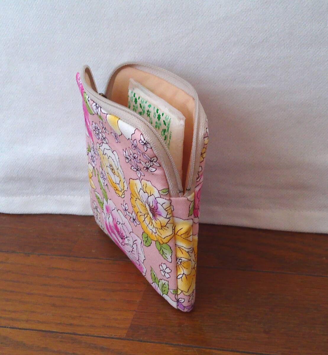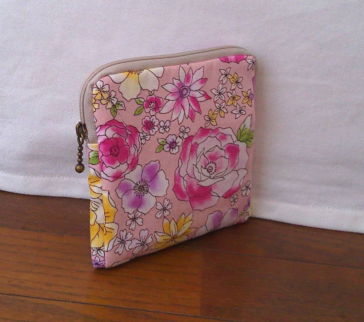 ★スクエアポーチ★ピンク地ピンクパープルイエロー大花小花