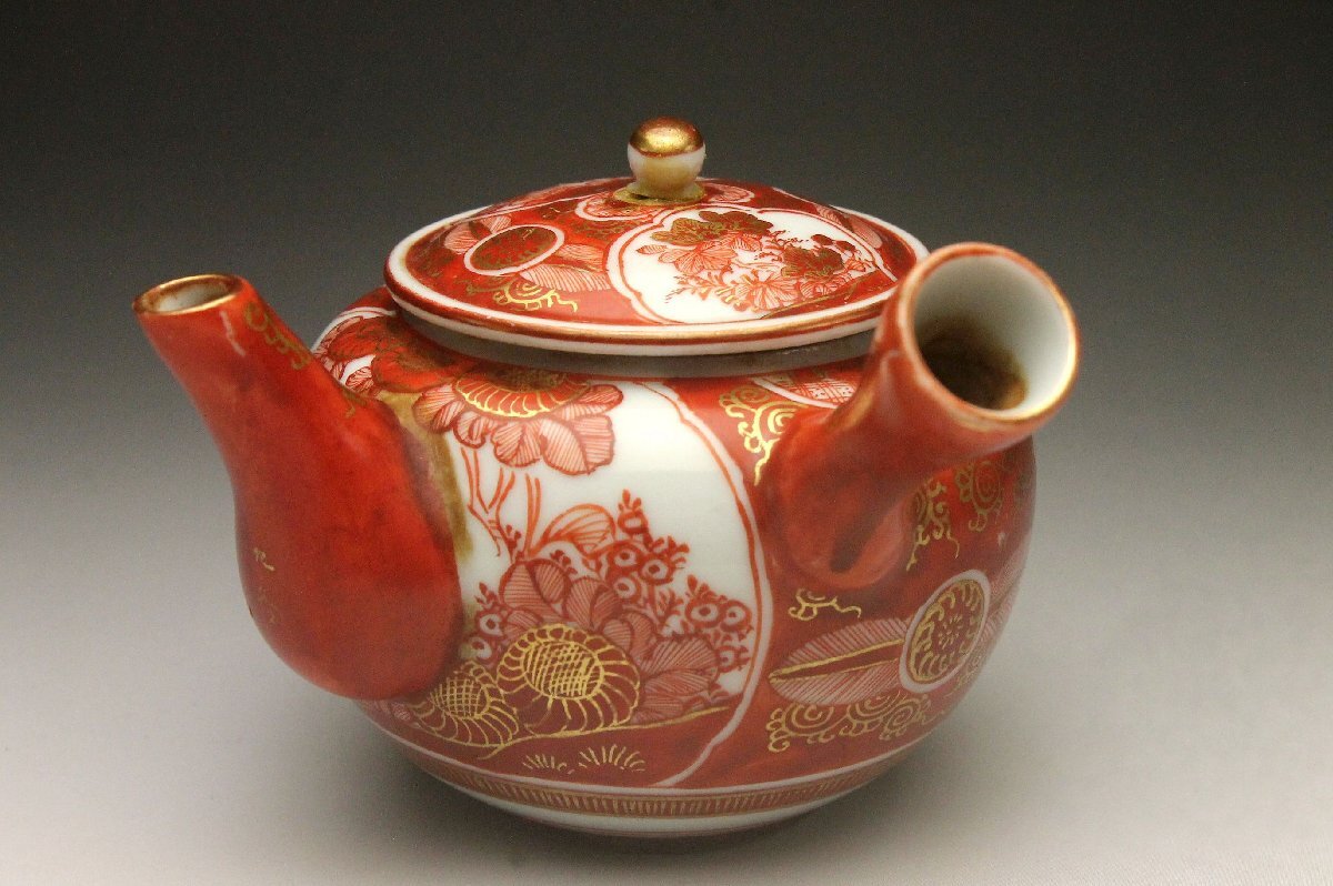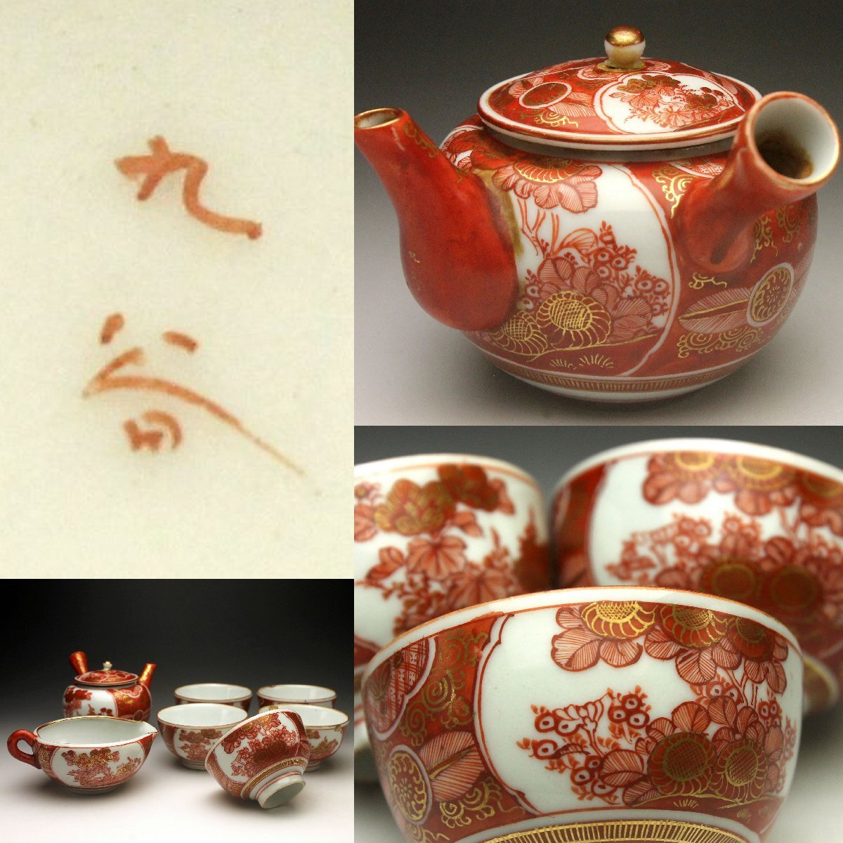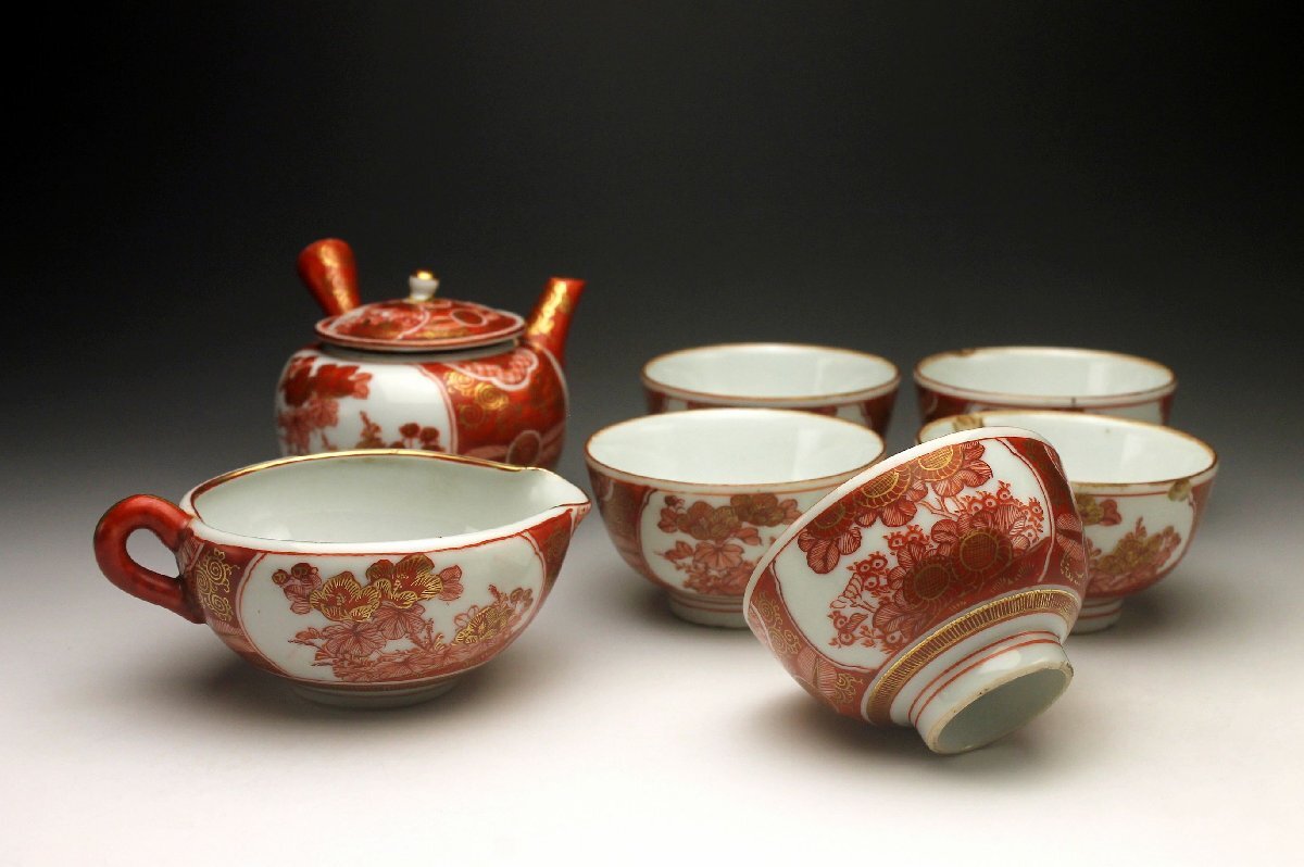 【余韻】 骨董品 古九谷 金襴手唐草菊文 煎茶器一式(7点)★時代物 後手急須 湯呑5客 <同梱可>