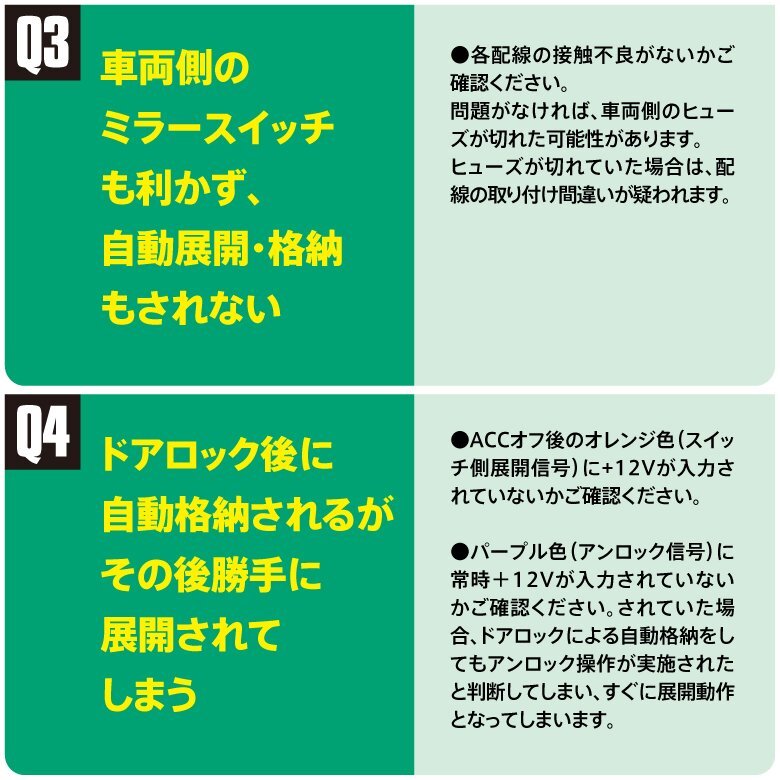・ミラーの手動開閉スイッチが「開/閉」のどちらかに固定式の車両では、アンロック連動ではなく、ACC(ホンダ車ではIG)連動とすることも可能です。
