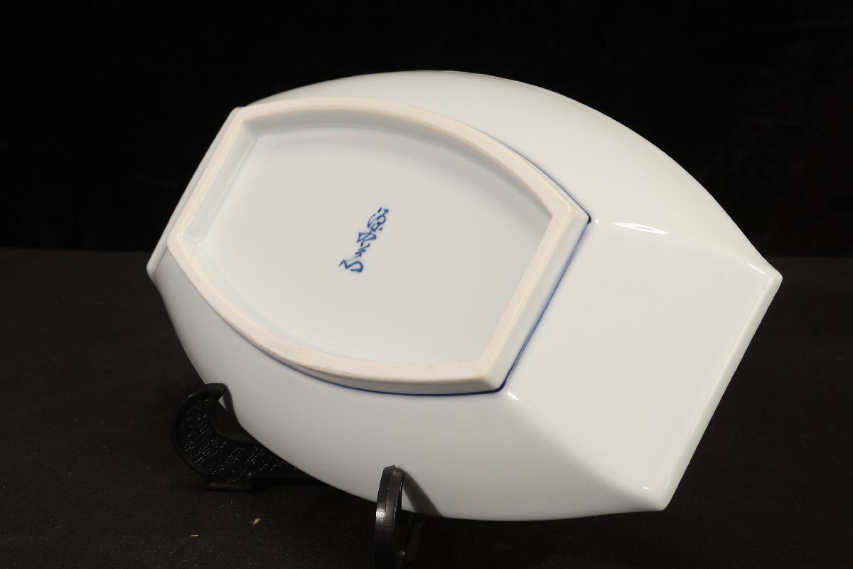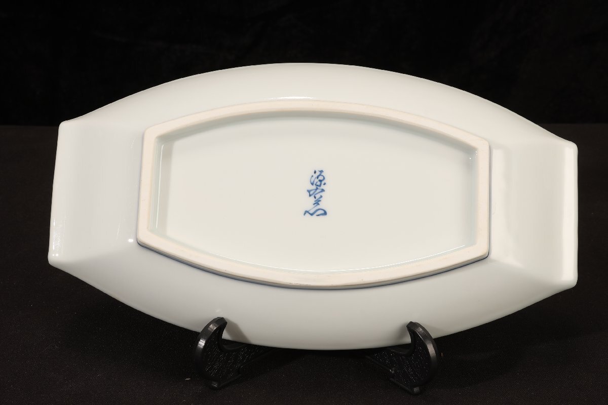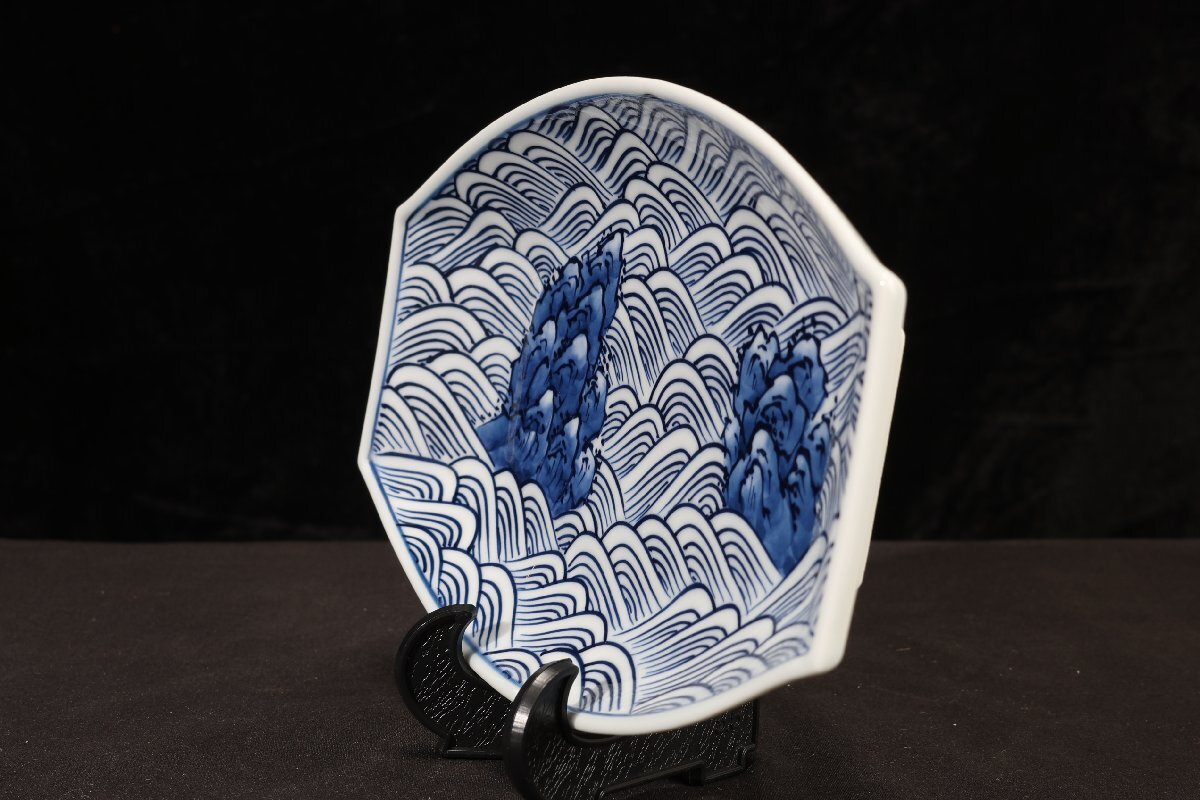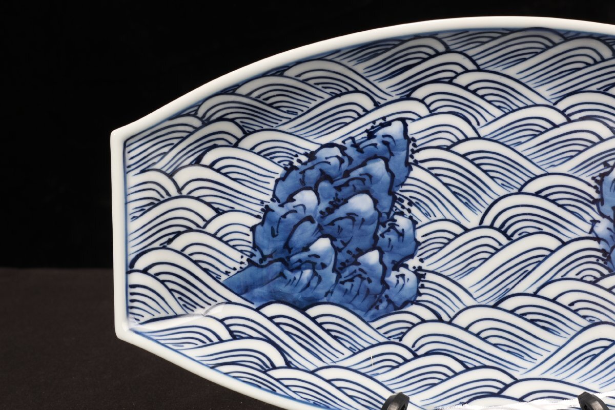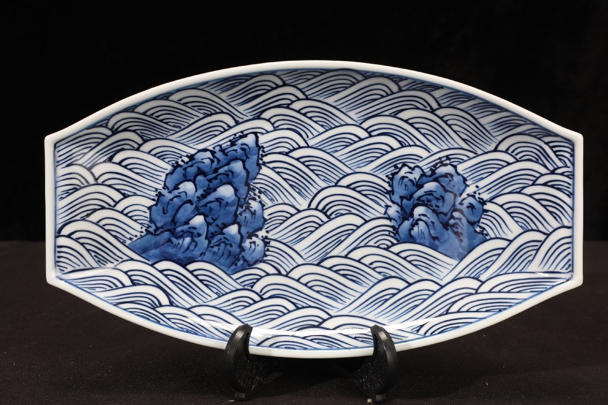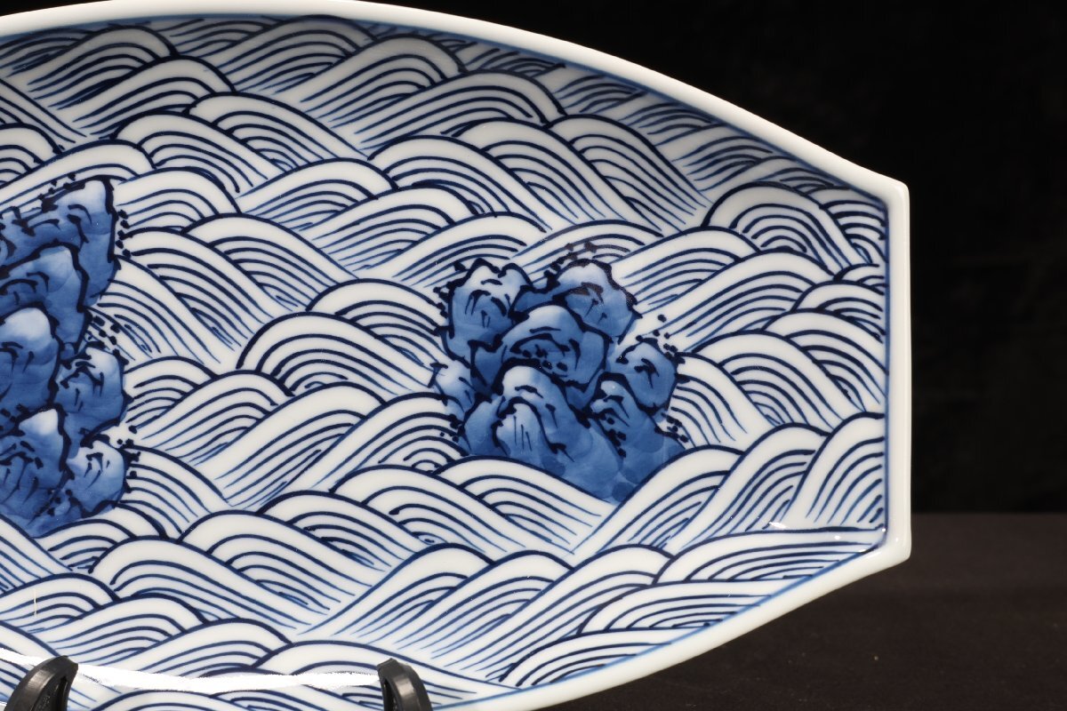 Product name: 珍品堂 1円から H69-05 有田焼 源右衛門窯 染付岩波紋 船形皿 5枚 共箱 木箱 時代物 古美術 骨董品 アンティーク