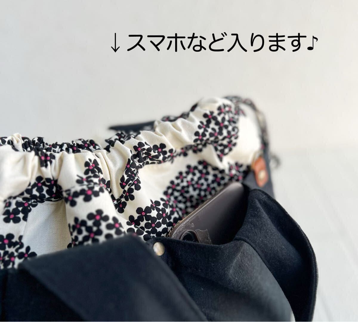 ハンドメイド*ポケットいっぱいbag*ころんと丸い巾着トートバッグ◯ヴィンテージ加工コットンリネンキャンバス×フラワー柄◯花柄◯黒