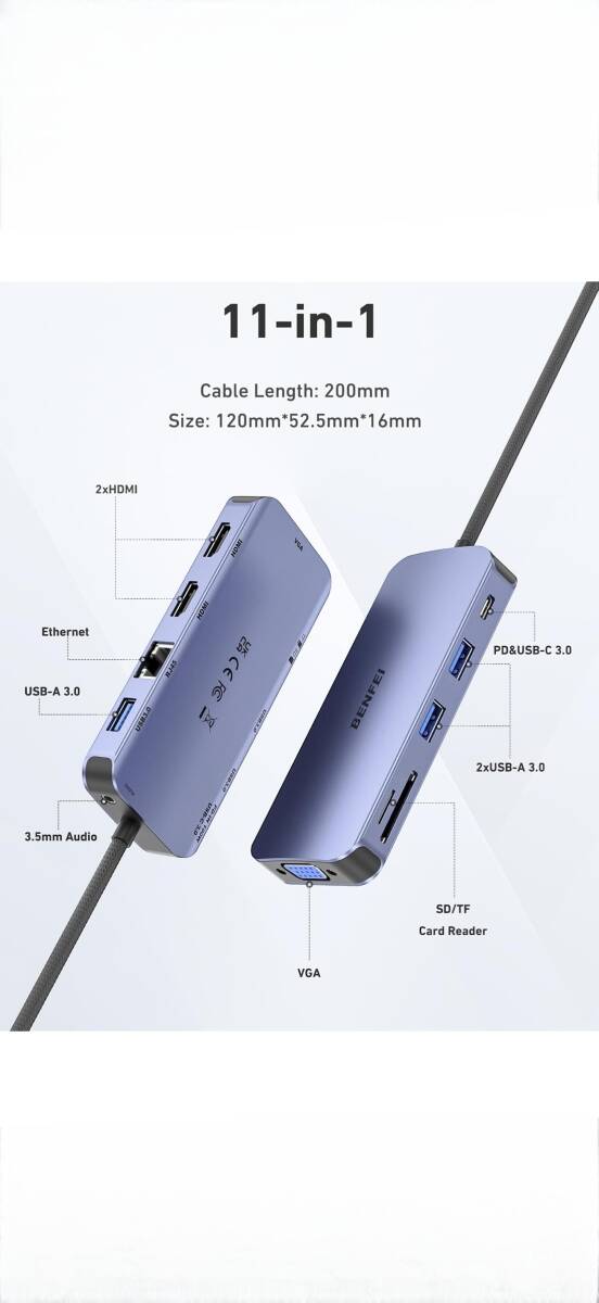 【1円オークション】BENFEI USB-C 11-in-1 マルチディスプレイドッキングステーション 高耐久シリコンケーブル付属 AET0608