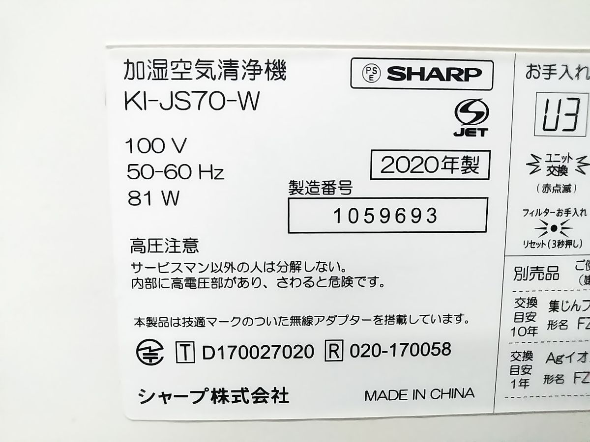 Product name: ★SHARP/シャープ KI-JS70 加湿空気清浄機 プラズマクラスター 25000 2020年製 スリムコンパクト 0802-310G ○ @160★