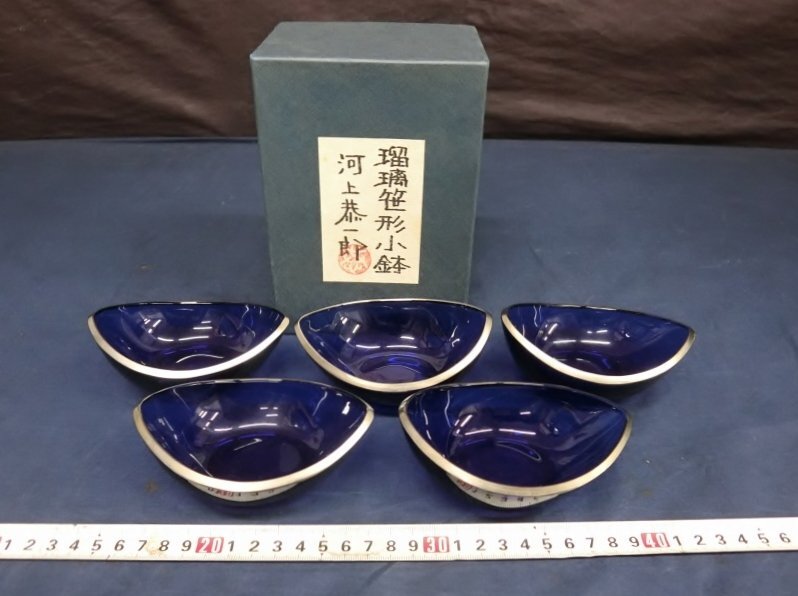 Product name: L7828 河上恭一郎 銀彩 瑠璃笹形小鉢 五点 紙箱