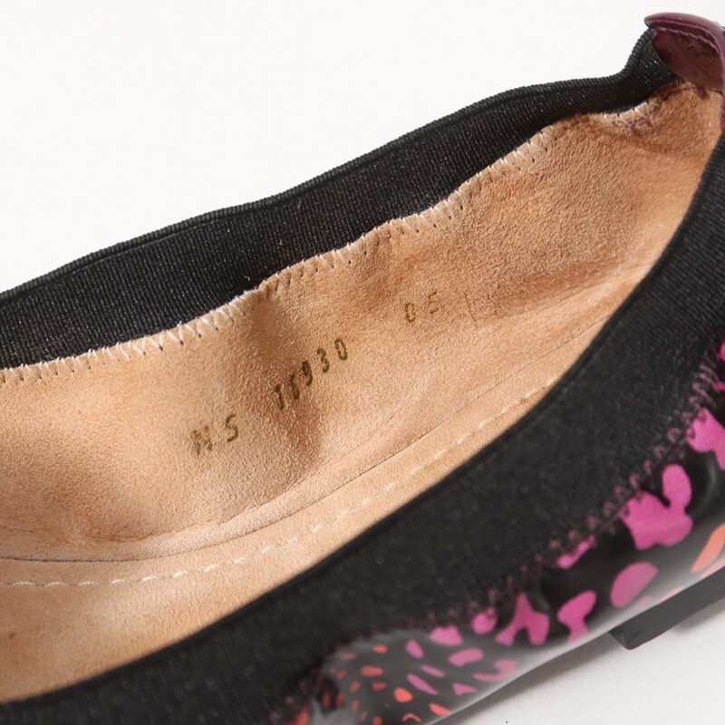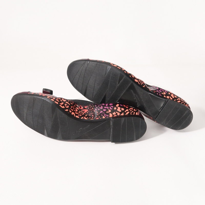 パープル、オレンジを基調としたレオパード柄プリントが目をひくバレエパンプス。