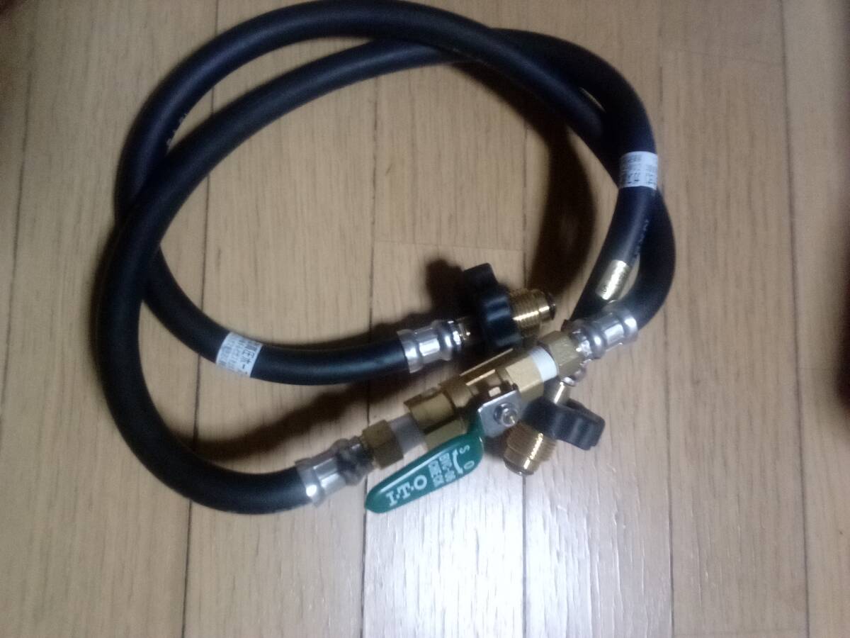 使用の際はガスボンベタンクが2本接続使用しガスタンクボンベからガスタンクボンベにガスが移せると言うホースです。
