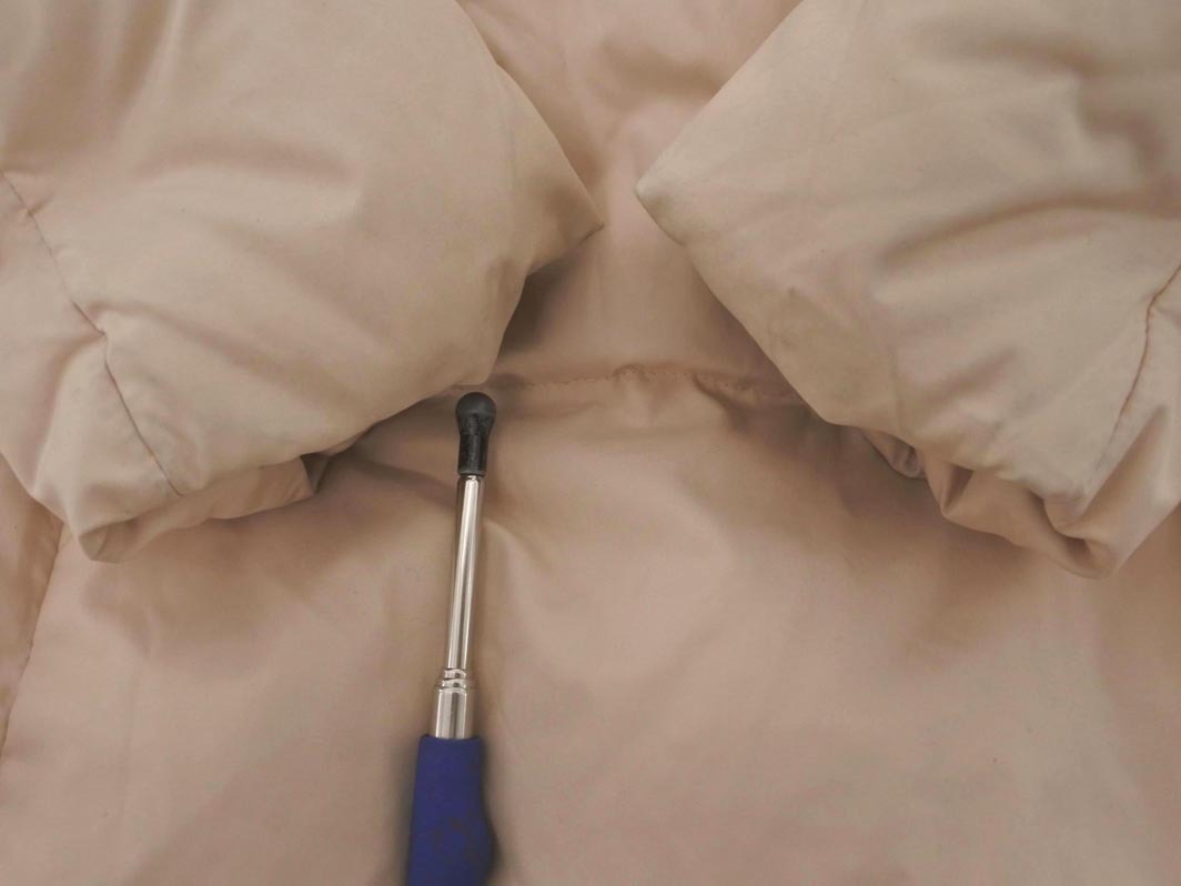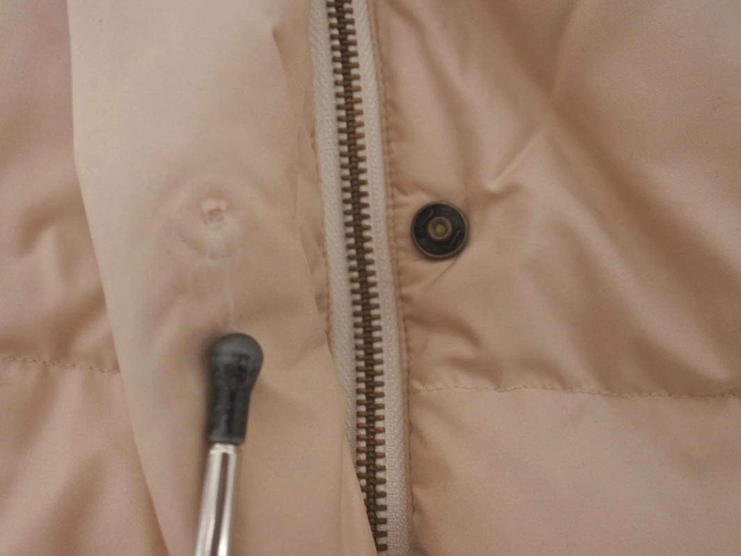 前身ごろ下から2番目のボタンが片方取れていますが、もう片方についている状態です。