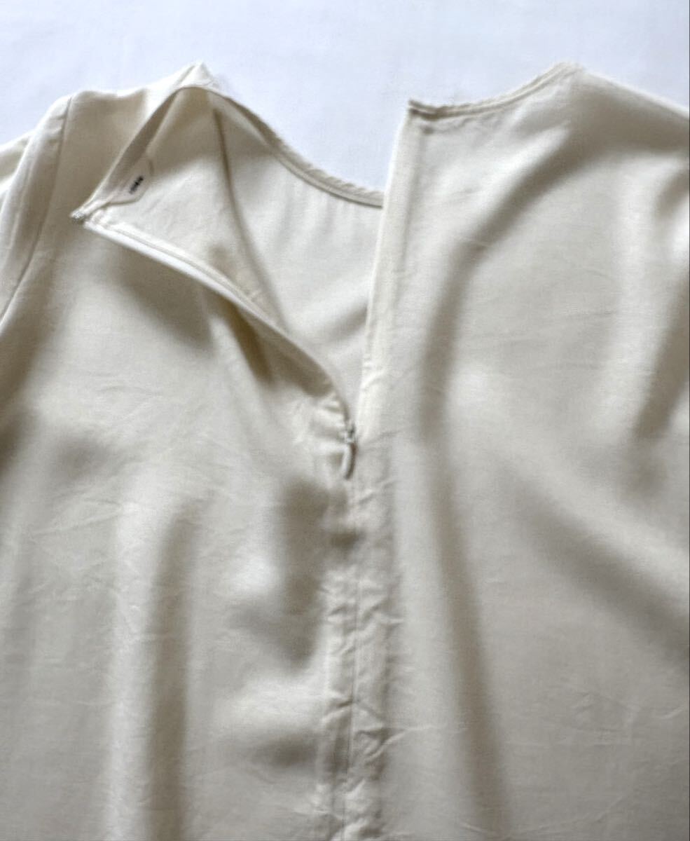 「イエナ」のブラウスです。サイズ・・・フリー(身幅約49cm、着丈約58cm)。素材・・・レーヨン51%、アセテート49%。カラー・・・オフホワイト。定価・・・12100円。きれい目にもカジュアルにもTシャツ感覚で幅広く着こなせるブラウスです。 しっかり二の腕は隠してくれ、詰まったネックやコンパクトなショルダーラインで華奢見えします。 身頃は少しゆったりしているので、体のラインもカバーしてくれます。 数年前に購入し、何度か使用しました。少ししわはありますが、目立つダメージはないです。ただ、あくまでユーズドですので、神経質な方はご遠慮ください。よろしくお願いいたします。