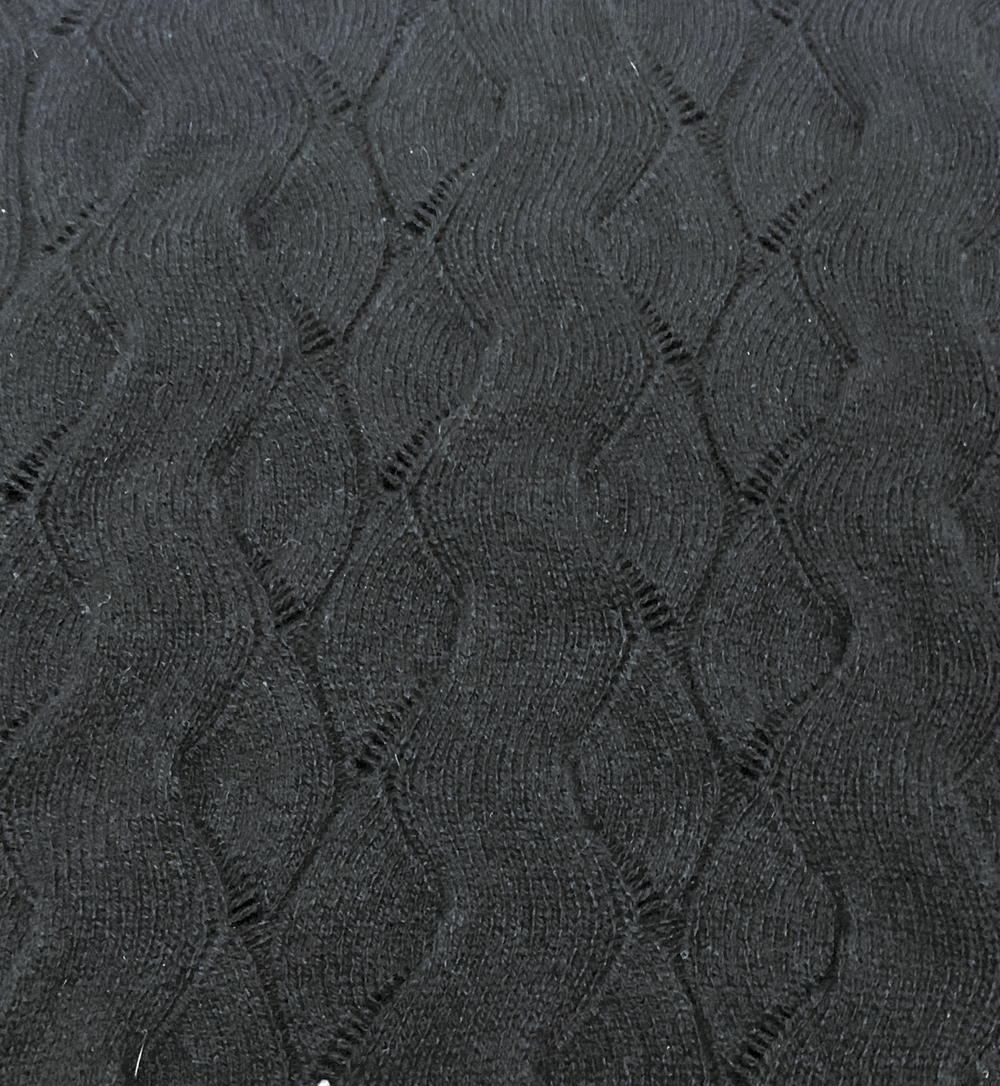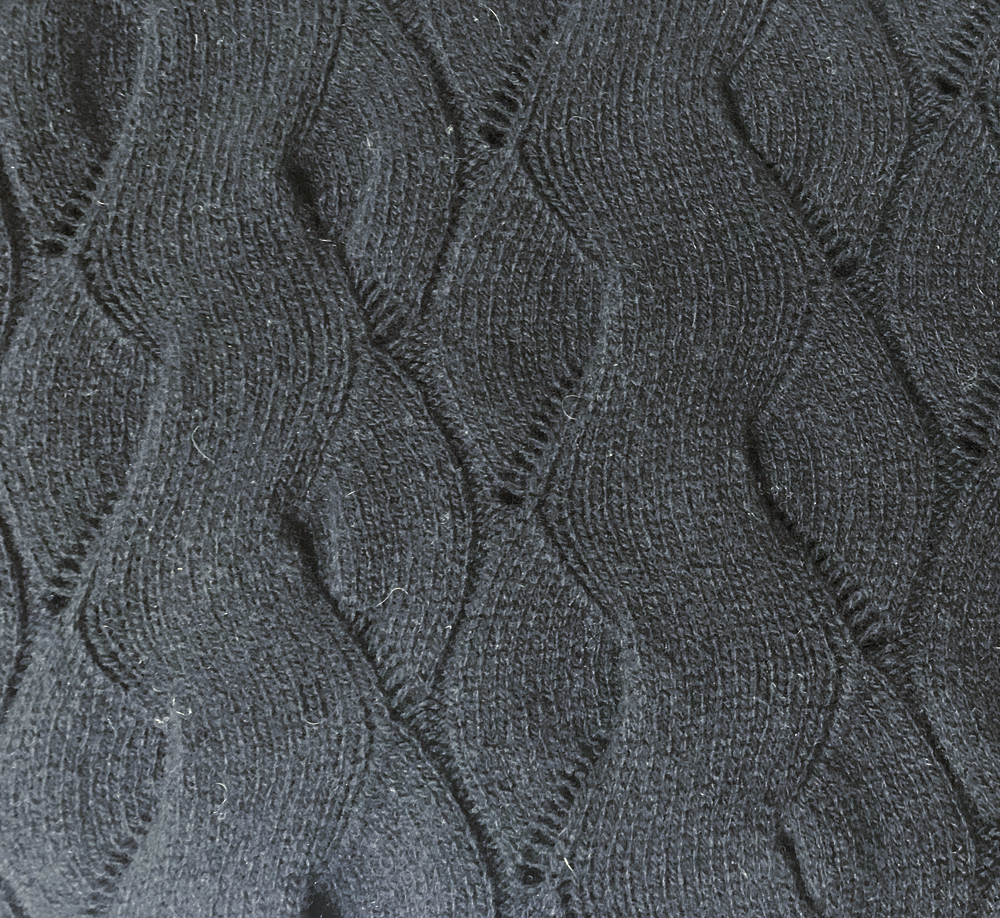 流れるような編み込み模様の軽やかな透かし編みニットは、軽量カシミヤならではの心地よい「ふわふわ」な肌触りが特長です。