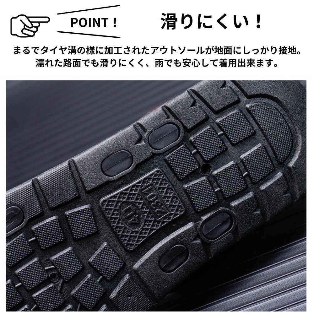 アウトソールは防滑製に優れ、雨の日でも滑りにくいように配慮。安全性も信頼できる。