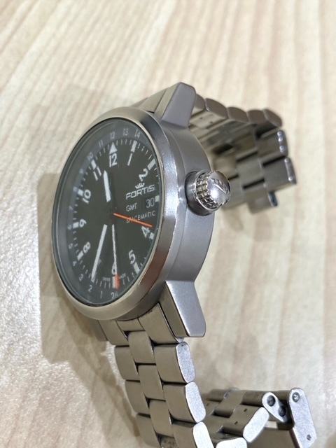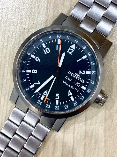 FS7-9-19 稼働品 FORTIS SPACEMATIC フォルティス 自動巻き 腕時計 3針 メンズ GMT 黒 銀 ブラック シルバー 624.22.148 ベルト外れ品