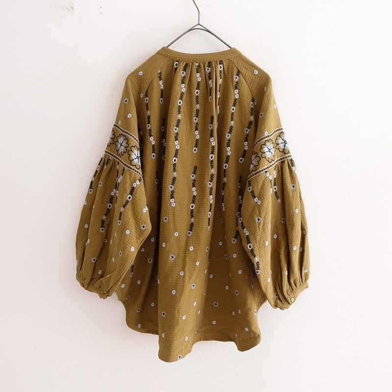 marble SUDのEMB anemone アネモネ バンドカラーブラウスです。カラーはキャメルで、ステッチ入りの接結ガーゼ地ベースに、ダークグリーン・サックスでアネモネの刺繍があしらわれております。バンドカラーのボリュームスリーブデザインで、オーバーサイズシルエットになっております。