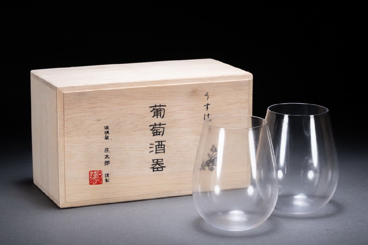 Product name: 【珍品堂】1円から O03-2 庄太郎製 葡萄酒器 ボルドー ペアセット うすはりグラス ロックグラス コップ ガラス工芸 共箱 木箱