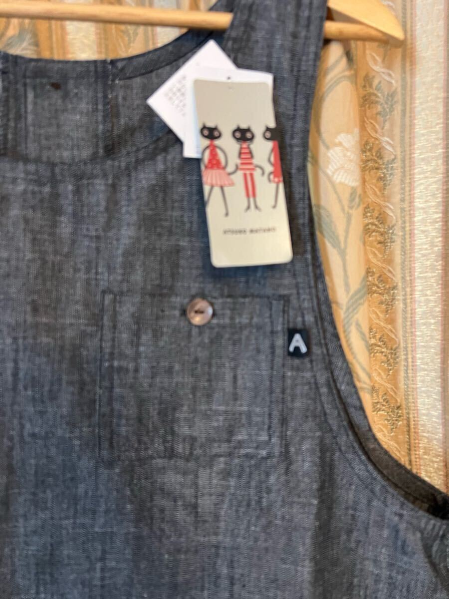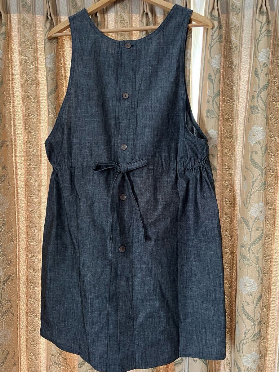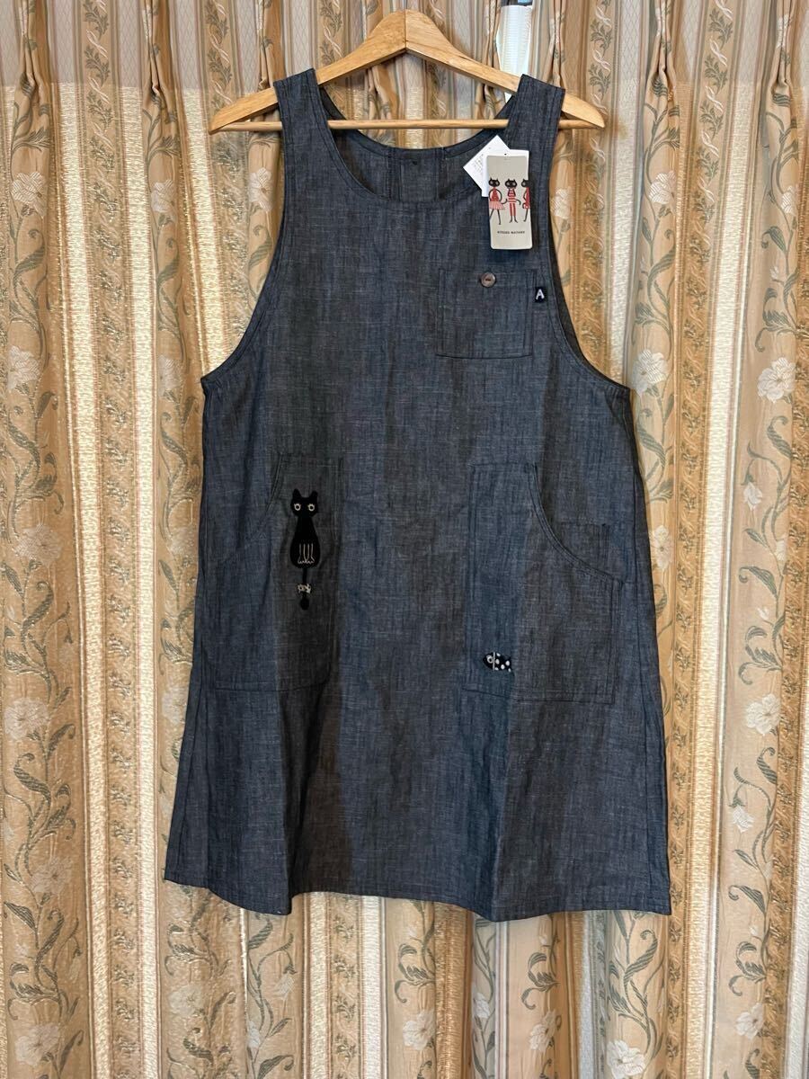 地は黒に近いグレー(紙タグにブラックと記載されています)、ねこは黒です。前身頃左右にポケットがあり、片側はペンを刺せる細めのポケットまでついて二重になっています。前身頃左右に加え、左胸にもポケットがあります。 背中をボタンで着脱します。写真のようにリボンを引っ張って身幅の調節も可能です。 エプロンとして使う以外にもパンツに合わせ、ジレやチュニック風に着てもよいかも(動きやすいよう袖のくりは大きめなので、下にタンクトップやTシャツは必須) 丈は、肩部分の腕側の端から裾まで約80センチ、脇幅は、腕ぐりの1番下(バストの下あたり)の端から端までで約51センチとなります。腕ぐりを広くとって、動きやすくかつバストサイズに関わらずお召しになれるデザインになっていると思います。素人採寸ですので誤差があるかもしれませんがよろしくお願いします。